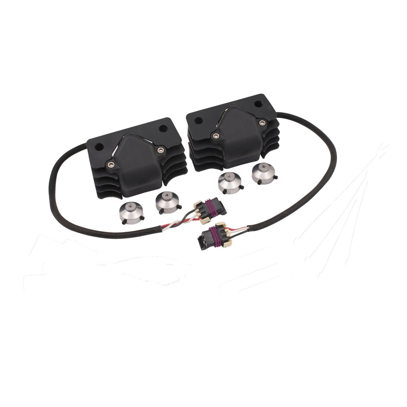COP (Coil On Plug) coils are mounted directly on the spark plugs and plugs into stock wiring. A clean stealthy appearance and the full boost of spark power since there are no spark plug wires to take energy away. Dependable and proven automotive technology. The cast aluminum cover holds the coil in place and doubles as a heat-sink for extra cylinder head cooling. Wiring is hidden in the cooling fins. Primary resistance 0.45 Ohm, like stock. Custom replacement single fire coils.
