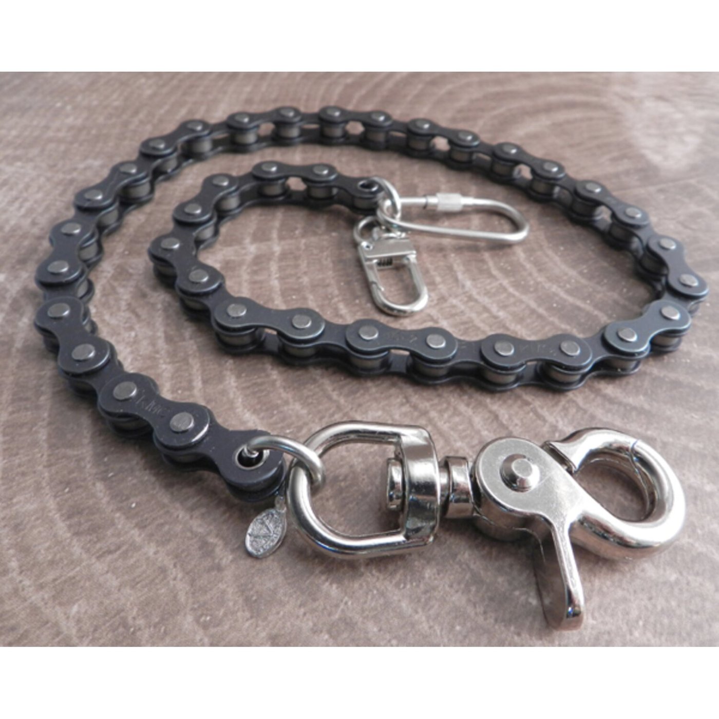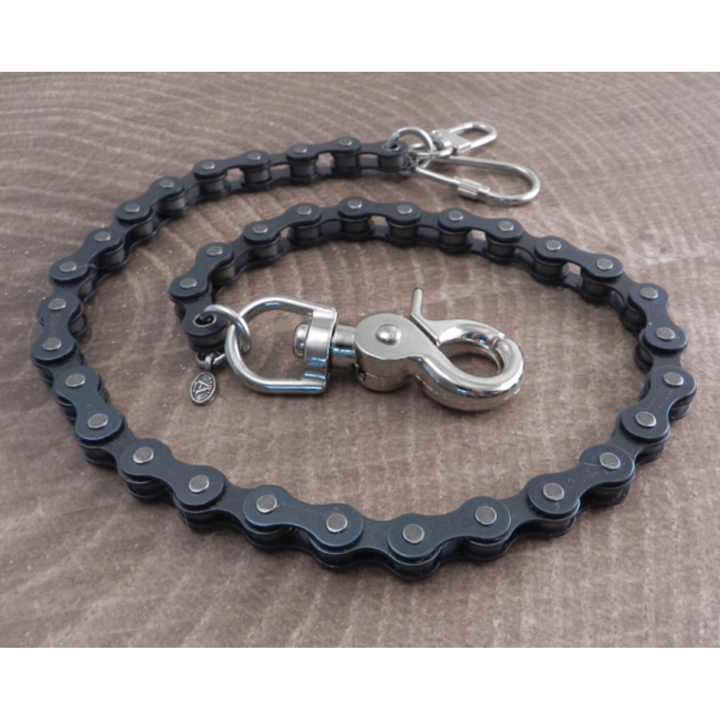 Black-coated heavyweight steel chain; chain links 7/8″ lenght by 1/4″ width; the sturdy snap hook and dual wallet hook end-pieces adds approximately 3″ to the chain length