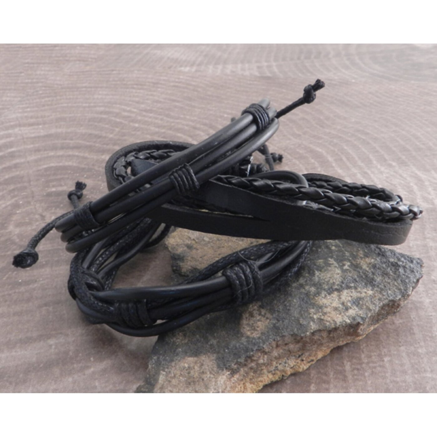 This Amigaz 3 pack set of black bracelets features 3 styles. The set has 1 pc. 8mm round coco wood beads, 1 pc. 8 x 2&3 mm coco wood disc beads and is nicely complimented by 1 pc. Braided 3mm cord bracelets. This is a generous grouping of bracelets filled with 2 stretch cord bracelets and 1 black cord bracelets that have a disc and loop clasp.