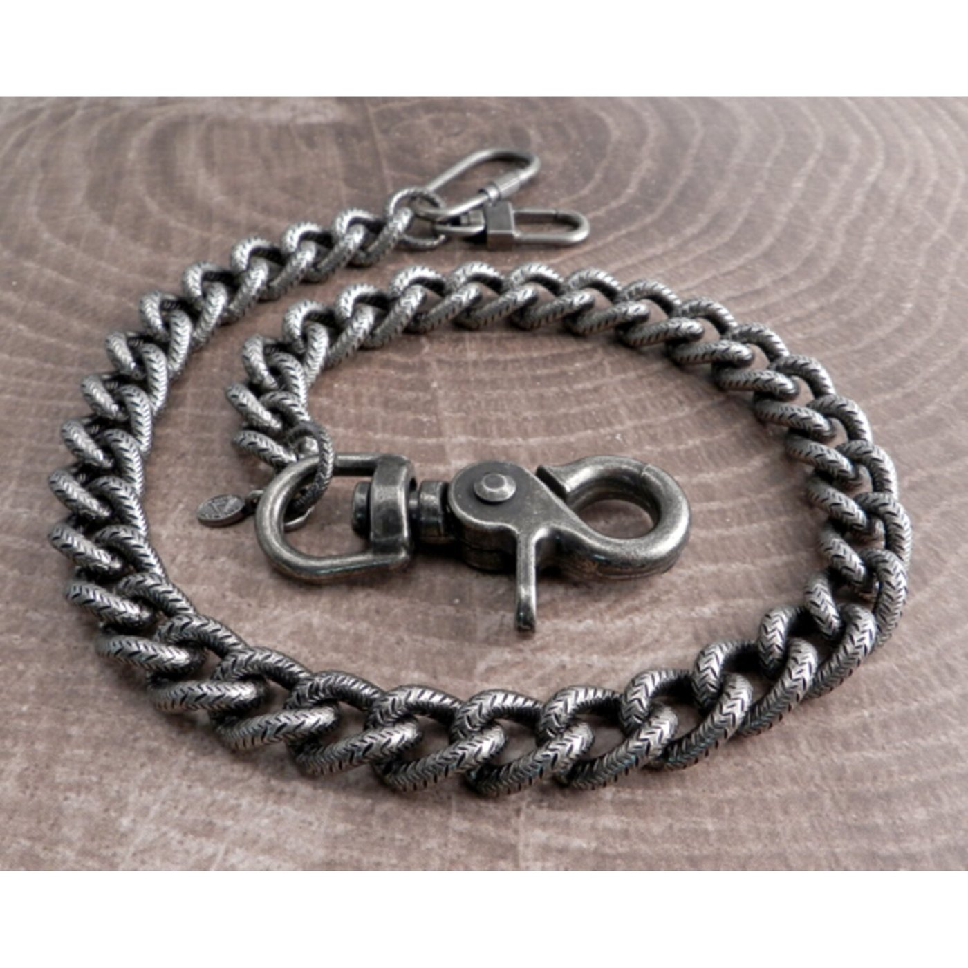 Silver; heavyweight chain with smooth links; steel with antique finish; chain links 3/4″ length by 1/2″ width; the sturdy snap hook and dual wallet hook end-pieces adds approximately 3″ to the chain length