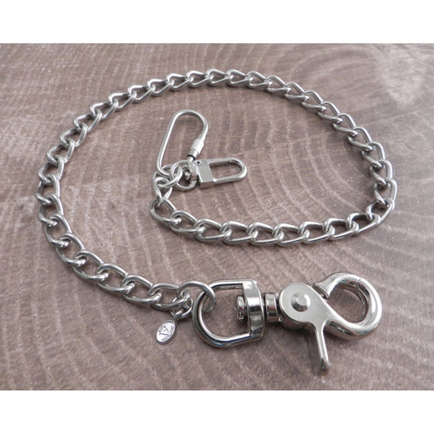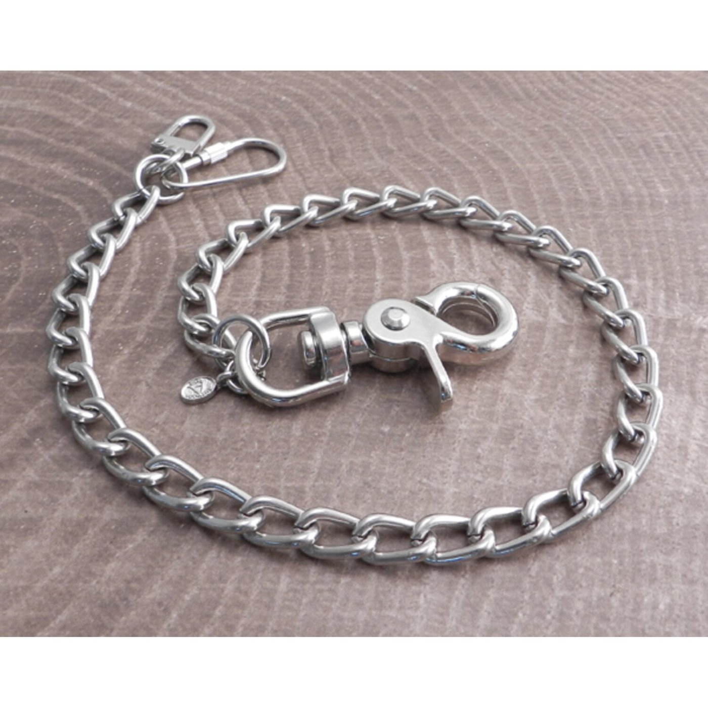 Silver; medium-sized chain with smooth welded links; nickle-plated steel; chain links 5/8″ length by 3/8″ width; the sturdy snap hook and dual wallet hook end-pieces adds approximately 3″ to the chain length