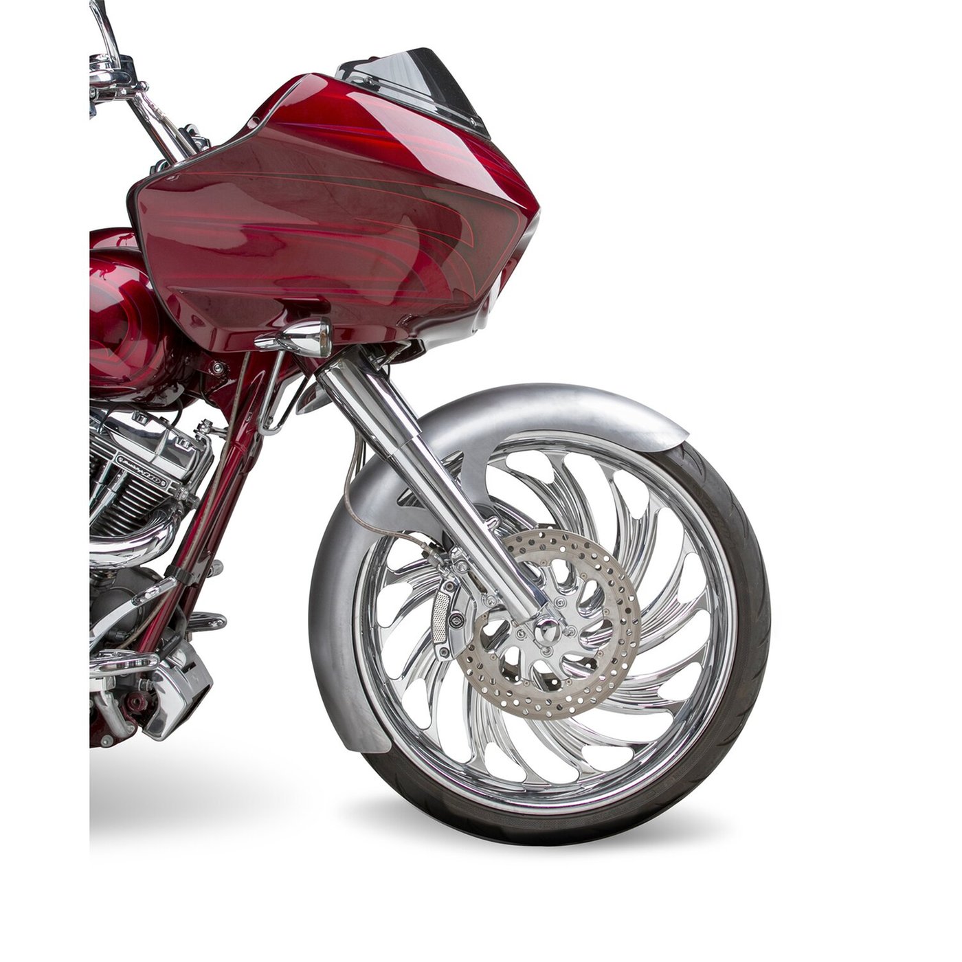 Stamped from one-piece 14-gauge steel sheet. Curvaceous full-length design for a perfect wrap. Bolt-on installation ease. Includes CNC machined black anodized aluminum brackets. Allows installation of up to 14″ oversized brake rotors. 23″ is approx. 6.30″ wide and accepts 130/60-23 tires