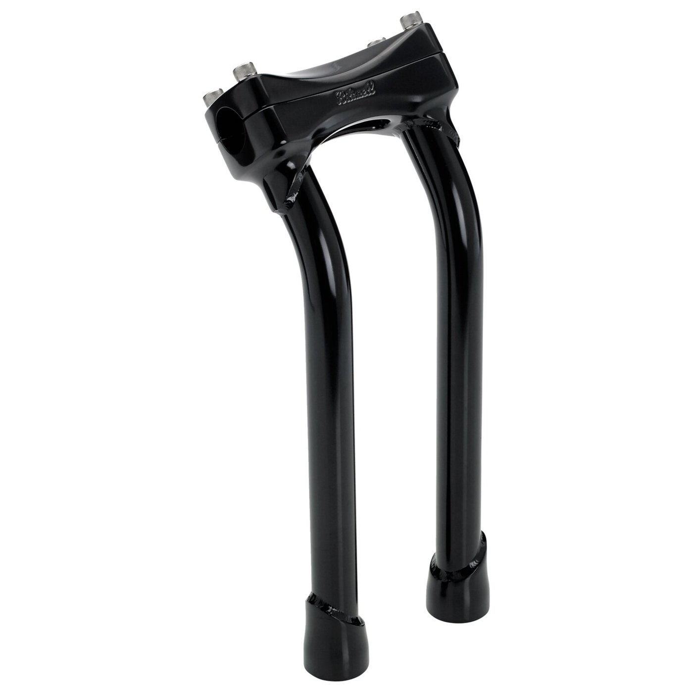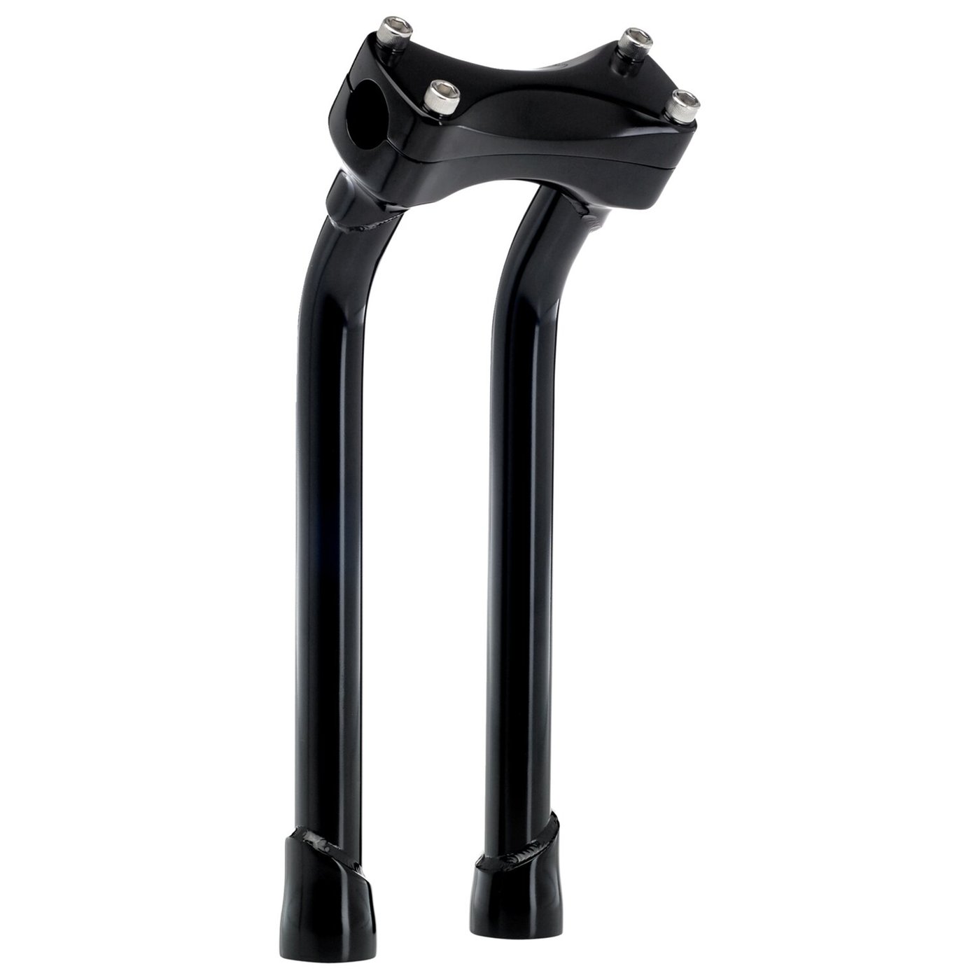 Gloss black electroplated finish. This comes with approval. With 2″ (5.1cm) pullback. For 1″ (25.4mm) handlebars. Constructed from investment cast steel upper & threaded lower. Riser tubes are TIG welded seamless 4130 chromoly with 3mm thick tubing and 1/2-13 threaded mounting holes which will take stock riser bolts. Spacing is 3-1/2″ (89mm), to fit most H-D top triple trees. The top clamp bolt pattern will take stock H-D speedo & tach brackets. Note: Check your local MCS dealer or the MCS sales department for exact type of approval and validity on bike model and years on the test report.