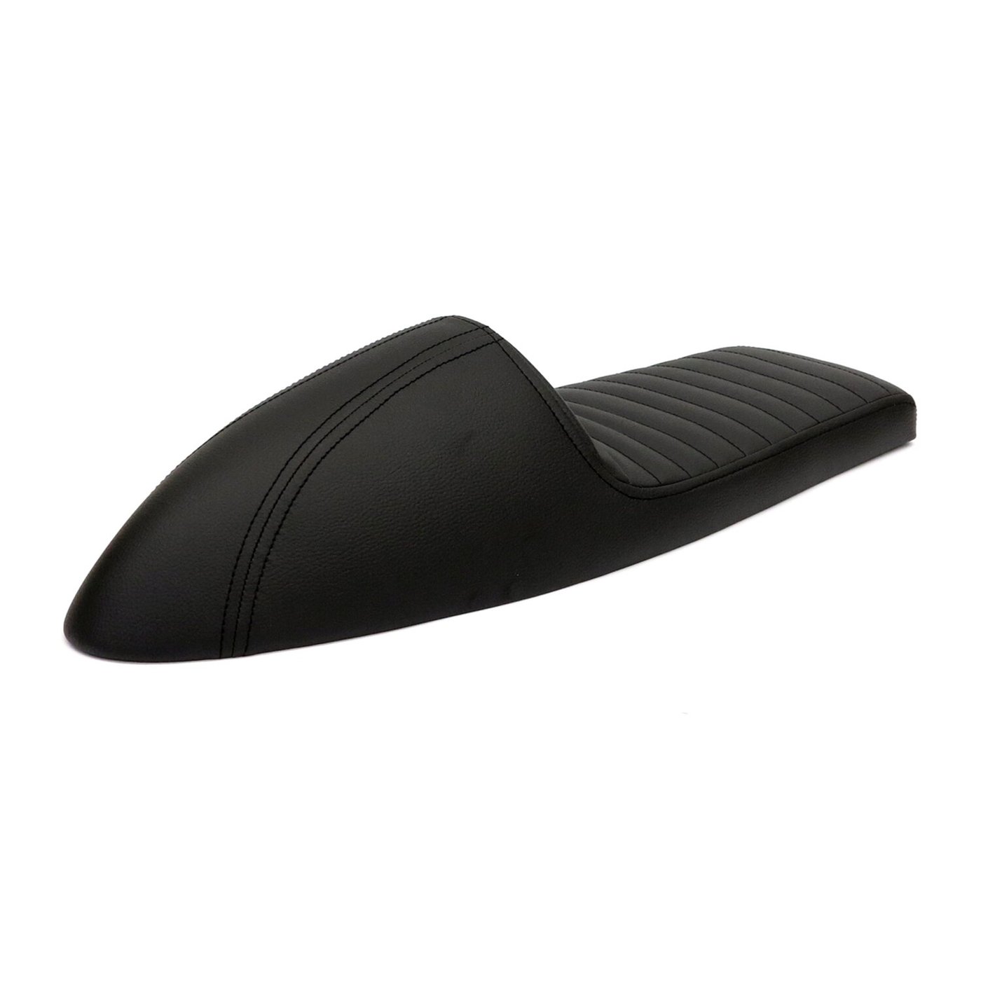 With black synthetic leather and a long cowl. A universal Café Racer solo seat where seat and cowl are both fully covered with synthetic leather. Seat cowl and upholstery base is a single part and comes with 4 mounting points (M6-Steel plus nuts) for easy installation. Made from unpainted black ABS plastic and comes with 20mm thick seat foam that is covered with a water repellent membrane below the synthetic leather upholstery. Note: Installation modifications may be required.