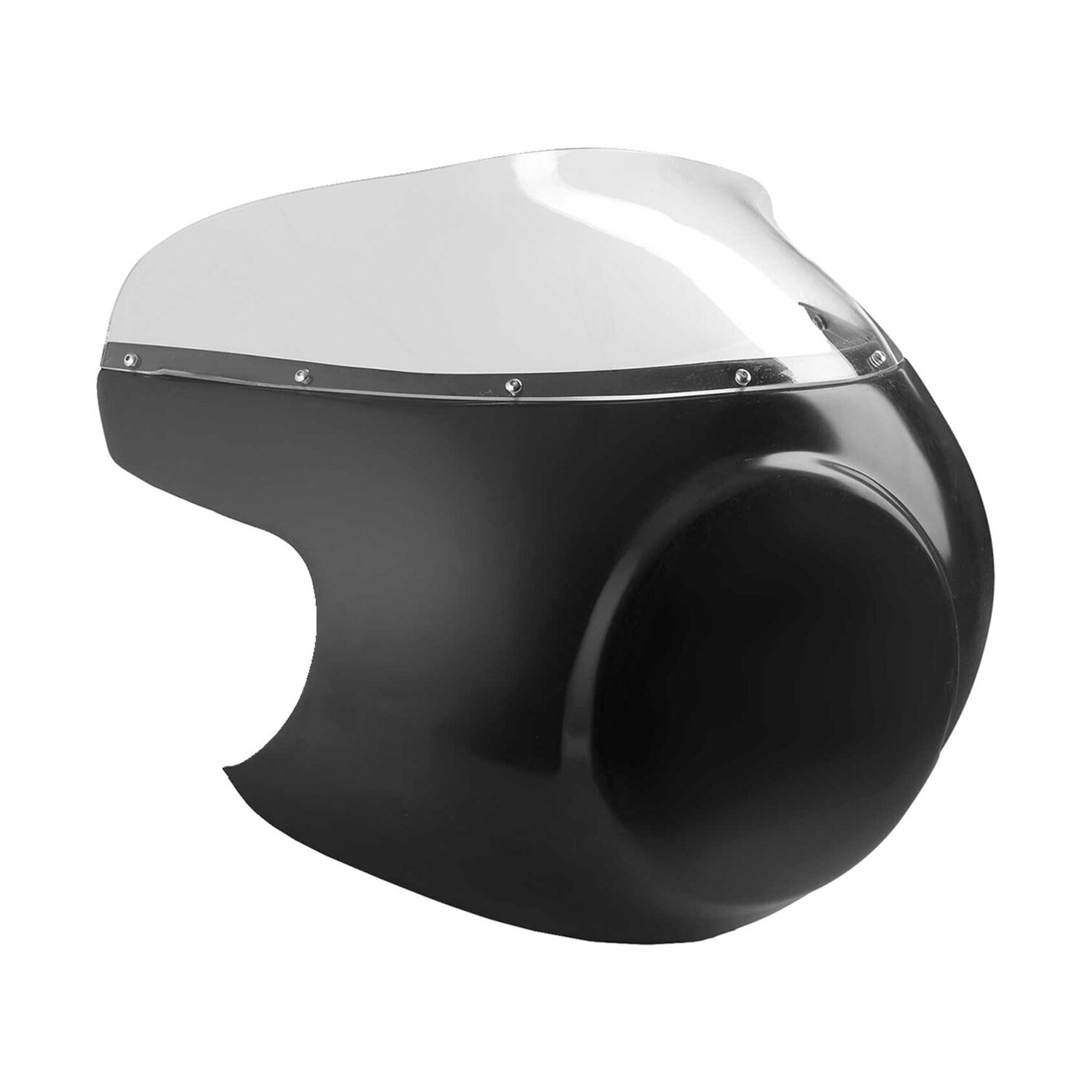 Classic racing fairing kit for Café Racer motorcycles. With a closed headlamp section for racing, which can be cut open to accommodate a headlamp for street use. Manufactured from black unpainted ABS plastic with a clear plexiglass windshield. Easy to trim, cut or drill and can be painted in any desired color scheme. Requires a custom installation. Sold without brackets or hardware.
