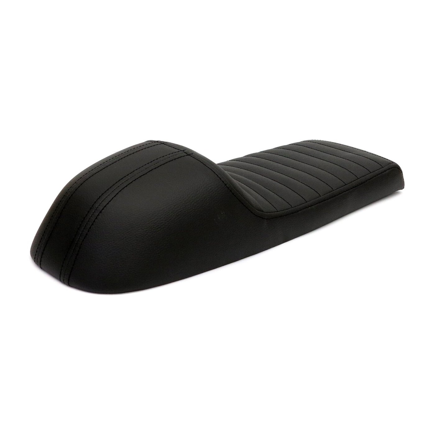 Universal Café Racer seat with a seat upholstery of black synthetic leather. Seat cowl and upholstery base are one-piece, fully covered with synthetic leather upholstery and come with 4 mounting points (M6-Steel plus nuts). Made from unpainted black ABS plastic and comes with 20mm thick seat foam that is covered with a water repellent membrane below the synthetic leather upholstery. Note: Installation modifications may be required.