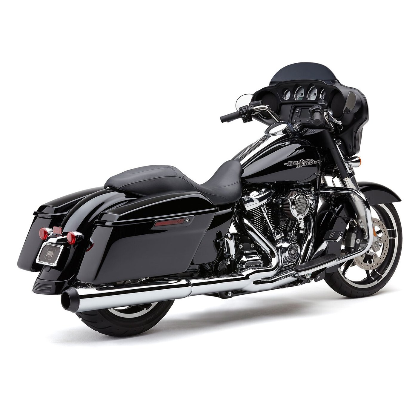 Chrome with satin black tip. Complete 2-1 system that comes with 1-1/4″ head pipes, seamless 2 1/2″ heat shields, 2 1/4″ collector shield and headers are stepped to 2″ to match the inlet of the muffler. Muffler diameter is 4 1/2″ and comes with a 3″ stepped core. Proprietary sound tuning materials, that surround the muffler core, have been used to further design the sound and performance characteristics. The satin black Race Pro tip is mounted to the muffler with seven 12-point bolts. Perfection in looks, performance and deep thunder sound.