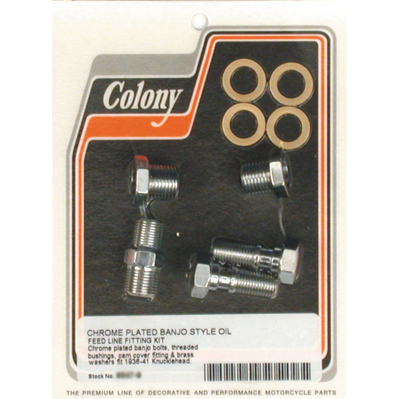 Chrome plated. OEM reproduction. For rocker oil feed line. Kit includes 3572-36B banjo bolts, 9536 threaded bushings, 3615-36 cam cover fitting and 3572-36C brass washers.