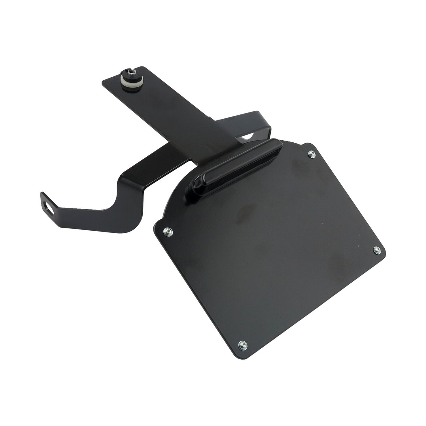Steel. Black powder coated. The stock Fat Bob license plate mount holder is easy to improve upon. This slick black powder coated steel bracket installs high, directly below the rear fender, showing the rear tire for that power-look. Easy install to the seat bolt and left & right fender strut bolts. Installation hardware included. Incl. Large LED license plate light. Note: Designed for use with a license plate only. Not for use in combination with license plate frames.