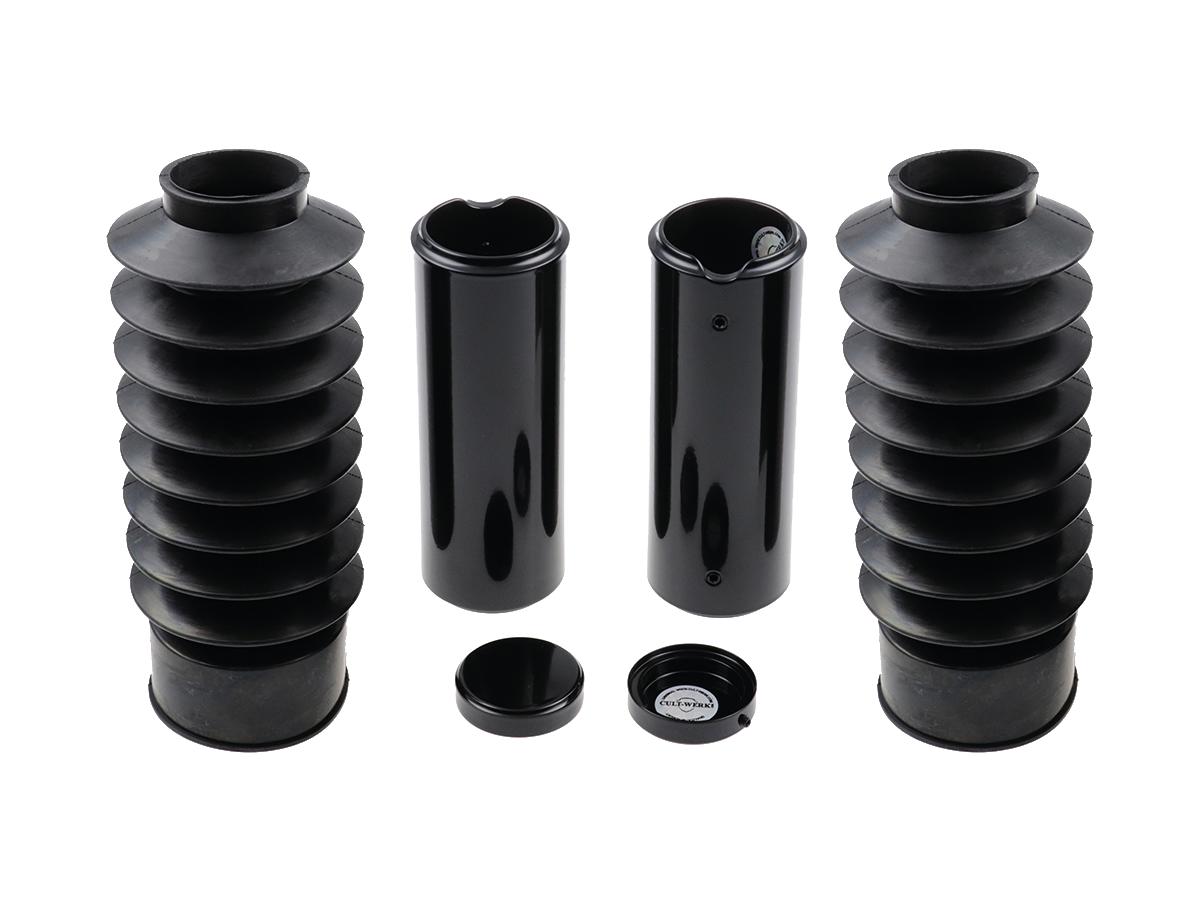 Cult-Werk 6-Piece Fork Covers with lower Fork Rubbers Long Version, with Cult-Werk Logo, relocated OEM Headlamp Mask and Front Turn Signal Position Black Gloss Powder Coated 921504