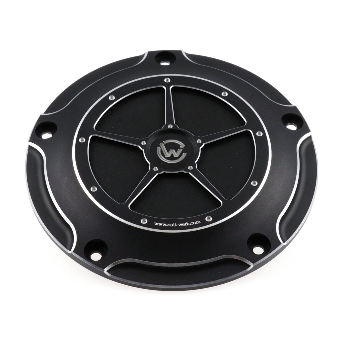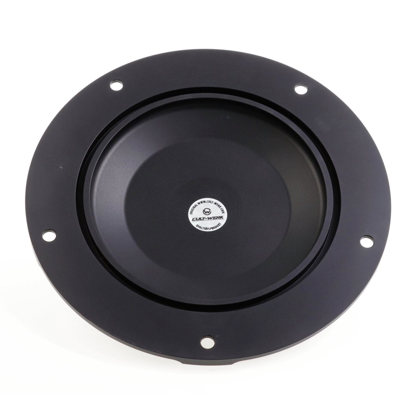 Black anodized high-end aluminum clutch cover. With precision milled and lasered Cult-Werk logo and contrast machining design. 7.75″ diameter.
