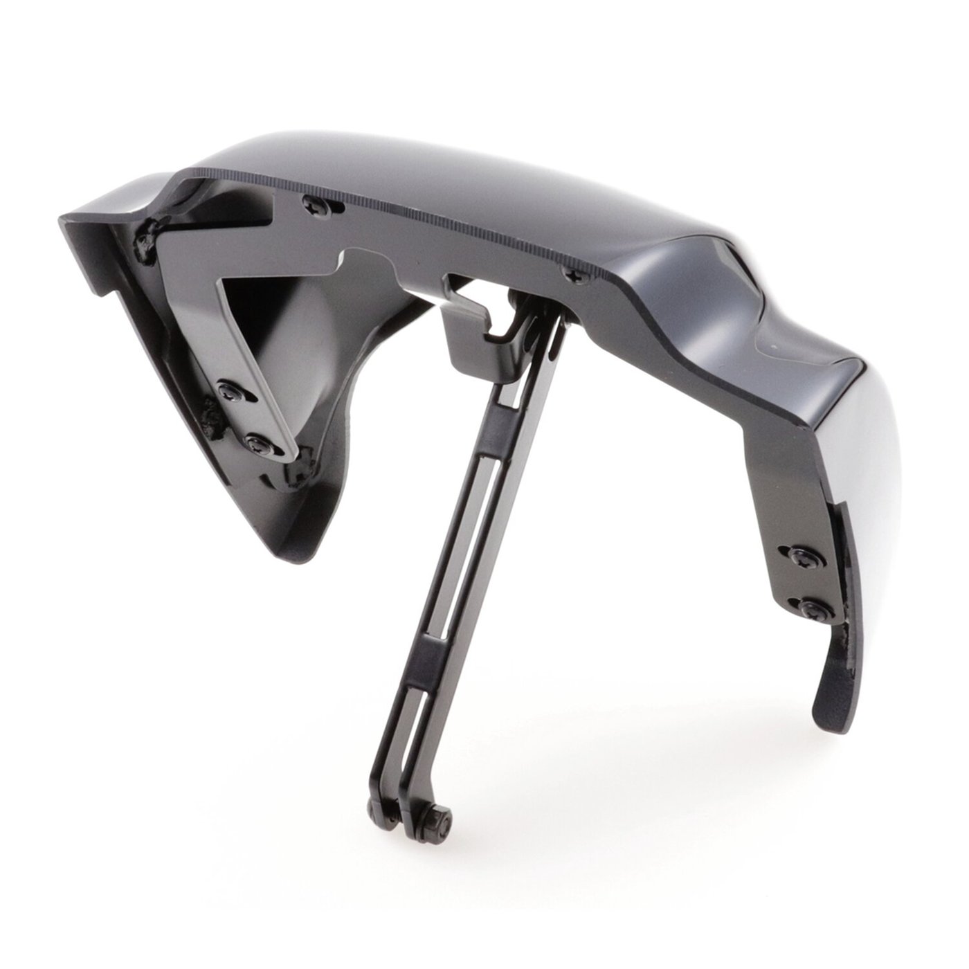 Unpainted gloss black finish. Used in combination with the OEM Scout Bobber LED headlamp which remains, like OEM, adjustable. The headlamp mask will move with the headlamp. Kit comes with a black powder coated CNC laser-cut steel bracket and a high quality ABS plastic mask. Provides a more aggressive look and optically makes the bike narrower on the front side. Mount holes are pre-drilled and installation is bolt-on to OEM mounting points and compatible with OEM cables and wiring. No modifications required for installation. This comes with approval. Note: Check your local MCS dealer or the MCS sales department for exact type of approval and validity on bike model and years on the test report.
