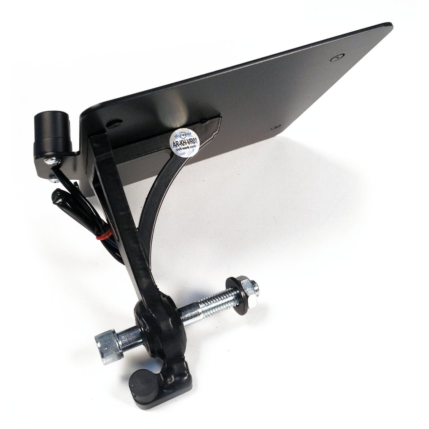 Gloss black powder coated CNC machined steel with pre-installed ECE approved LED license plate illumination. Extra short mount for a close-to-the-bike-installation for the integrated look. Mounts to left side lower shock mount, the required longer shock mount bolt is included with all other required installation hardwareThis comes with approval. For 210 x 170mm size brackets (width x height). Note: Check your local MCS dealer or the MCS sales department for exact type of approval and validity on bike model and years on the test report.