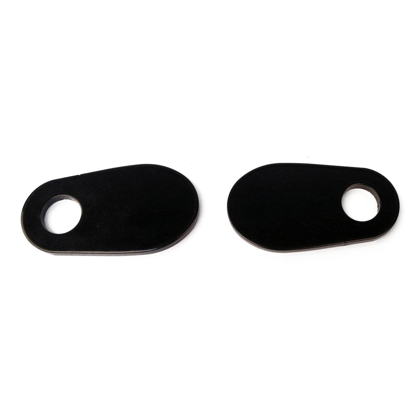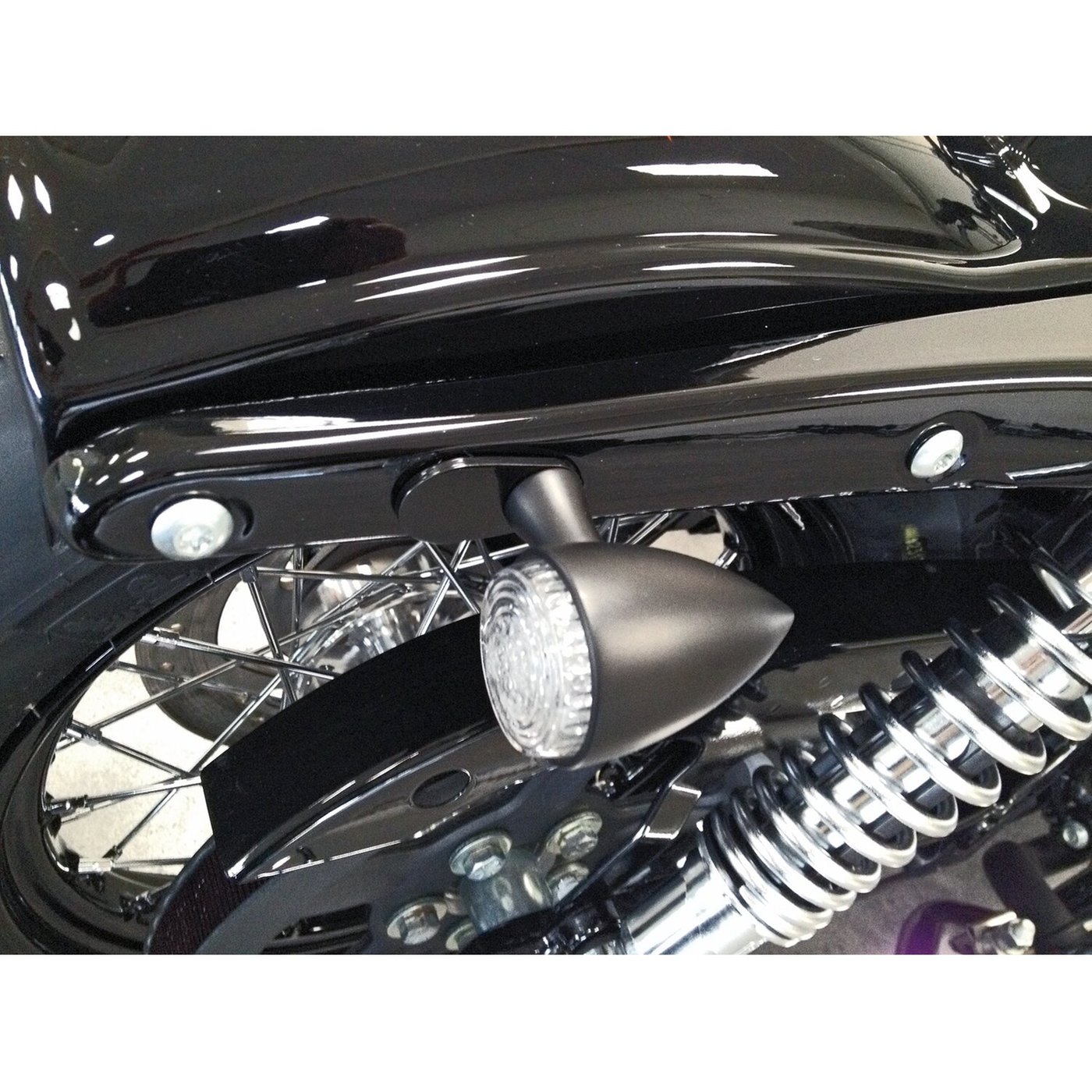 Gloss black powder coated laser cut machined steel. Compatible with virtually all turn signals with 8 and 10mm mounting bolt diameter. Mounts to fender strut. Great for a custom install or turn signal relocation use. – Rear, no angle – For 10mm & 8mm threaded turn signals.