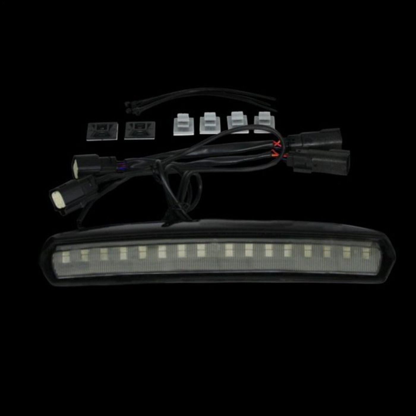 LED light unit to mount to the top of your Tour-Pak®. Adds 32 run/brake LEDs and 16 LEDs per side for the red turn signal. The Light unit comes pre-taped for a peel & stick application to the top of King & Chopped style Tour Paks®. Includes plug and play wiring harness for simple installation.
