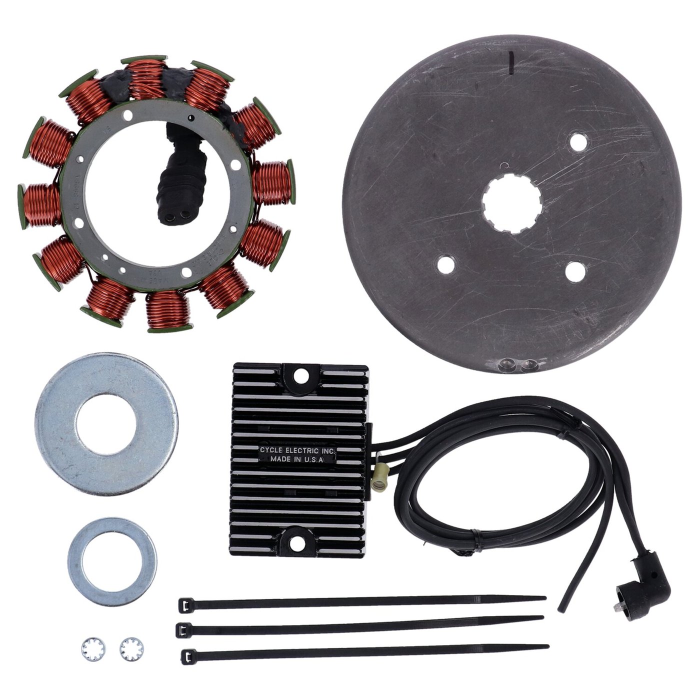 Cycle Electric Inc. Alternator kits combine our state of the art stators with our legendary bullet proof rectifying regulators. This complete charging kit includes: -Stator x1 -Rotor x1 -Regulator x1 -Hardware misc.