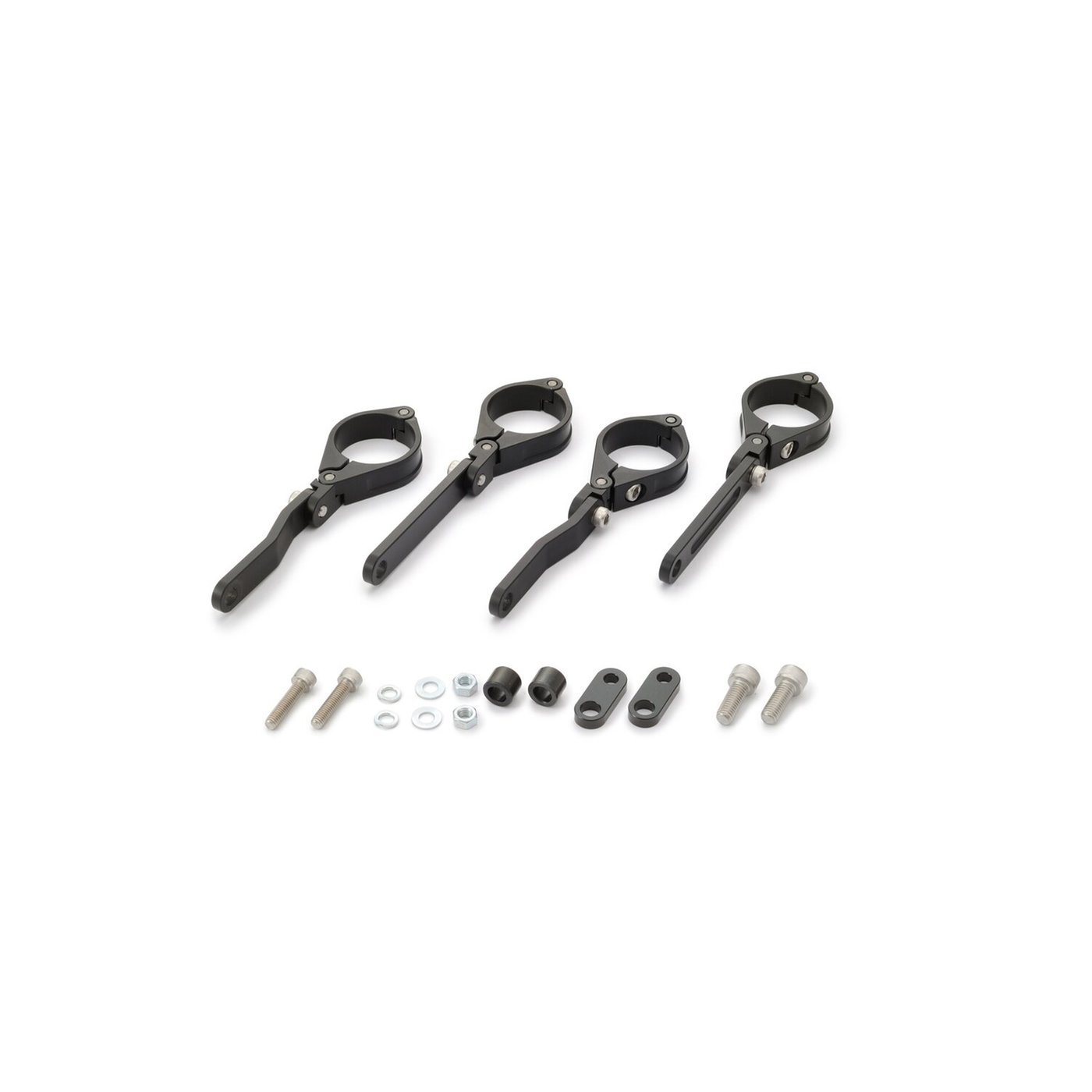 For 39mm diameter fork tubes. Black anodized CNC machined aluminium construction. These brackets have two clamps that can slide up and down the fork tube. By sliding both you can move your headlamp up and down, by sliding only one you can position the headlamp further in or out. Complete with turn signal mount kit for M8 threaded turn signals.