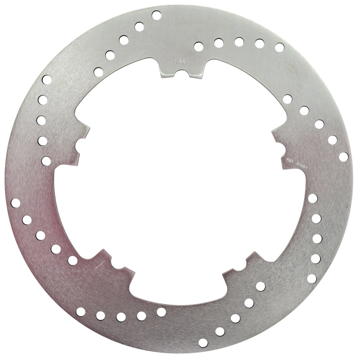 Stainless; left front; 11.5″ OD; open center; 6.7″ bolt circle diameter. ‘Half moon’ bolt style holes. Mount style ‘D’. Can be used with Organic & Sintered brake pads. 5mm thick. OEM replacement reference 44343-01