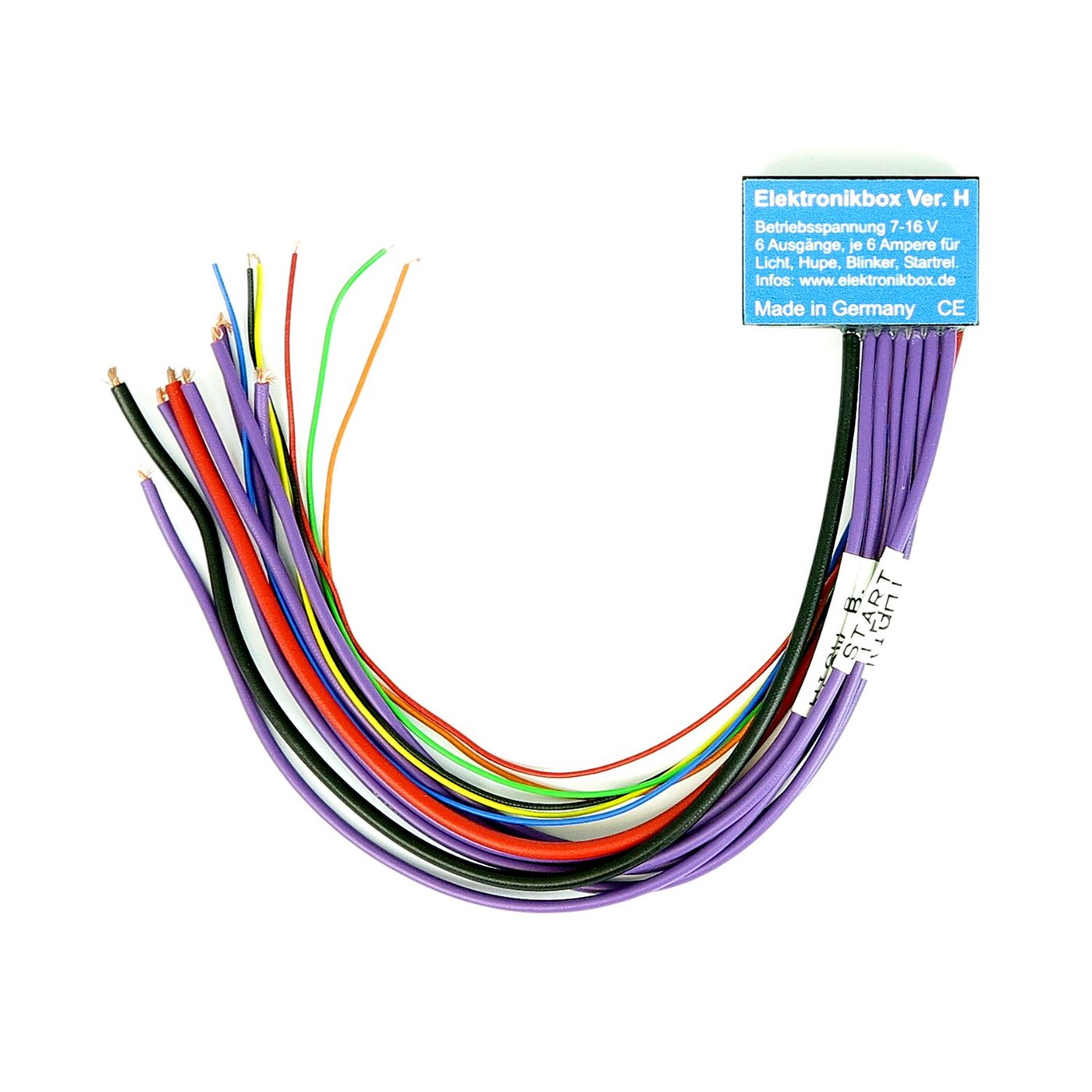 Basic brain box; Input voltage: 7 – 16 Volt; Connections: Control unit 0,5mm², user 1 mm², with 10 cm long wires; Max Amp. from 12V connection: 15 Amp.; Dimensions: 40 mm x 12.5 mm x 25 mm. When building a bike, or fully replacing the electrical wiring of an existing motorcycle, a brain box is a good option for a simple, solid and dependable wiring system. Lights are dimmed at starting. The brain boxes with handlebar wiring adapters simplify wiring and make it almost invisible when compared with some other brain boxes on the market. Housing is polycarbonate, waterproof cast with epoxy resin. Max. ambient temperature is 100 degree Celsius and maximum output is 5 Amp. per exit and 3 Amp. for horn. Compatible with miniature pushbutton control knobs that function with super thin wiring. Brain boxes can easily be tie-wrap clamped to frame tubes or similar. All come complete with super clear installation instructions. Note: Connecting starter motor directly on brain box will cause damage. The H-D starter motor takes 10Amp for the solenoid to switch and requires an additional small automotive relay between starter output of the brain box and the starter solenoid. Note: Added in 2025 a gray cable. It is an output for the indicator control led in the speedo. You can use this output if your speedo has only one LED for both directions.