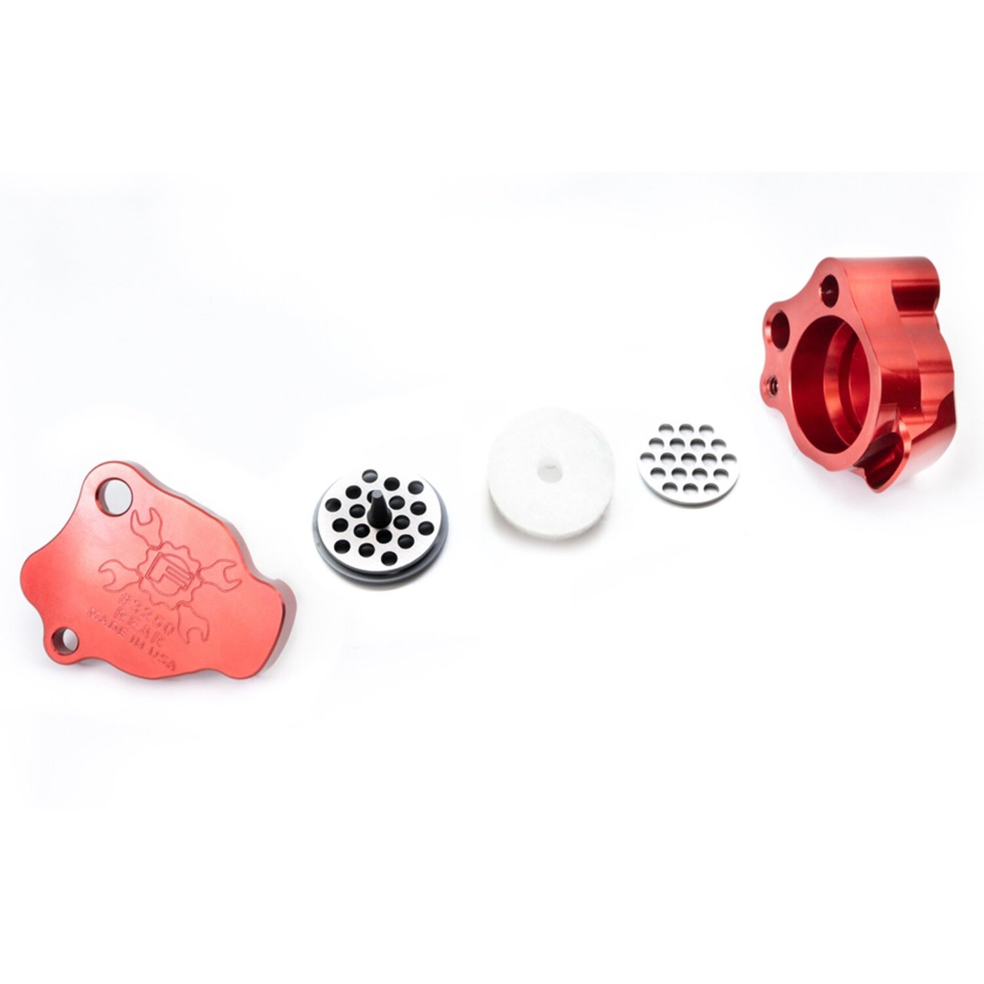 Machined from red anodized billet 6061 aluminum with square surfaces, excellent umbrella valve sealing, longer main breather exit nipples with dual O-rings to promote better breather system sealing. Properly sized breather inlets and location for optimum engine breathing. Unique design maximizes breather volume and allows for easy serviceability. Breather bodies have multiple drain ports located on the inside floor, ports are chamfered on ID to allow easy drainage yet squared off on exits to deter filling from splash oil. Kits include: billet breather housings, billet covers, breather filter elements, umbrella valves and quality hardware. Feuling cylinder head breathers work, seal and you will find they hold an engine vacuum. Testing shown on a healthy engine will see 3-4 oz of oil in the sump and once the dipstick is removed another 3-4 oz will drain. Note: Factory plastic OEM breathers can be problematic, material easily distorts, especially after seeing excessive heat then the internal umbrella valve struggles to seal, causing oil carry over. Another issue found with the OEM breathers is cracked and or broken exit nipples which can be caused by heat distortion and or improper fit and poor installation. This can cause the oil filled air to bypass the stock breather entirely. Note: Feuling breathers work, seal and you will find they hold an engine vacuum. Testing shown on a healthy engine will see 3-4 oz of oil in the sump and once the dipstick is removed another 3-4 oz will drain. Note that this test procedure can only be performed with a sealed engine meaning no external venting via dipstick or trans top cover. Breathers can be used with external venting via dipstick, trans cover and air cleaner. .