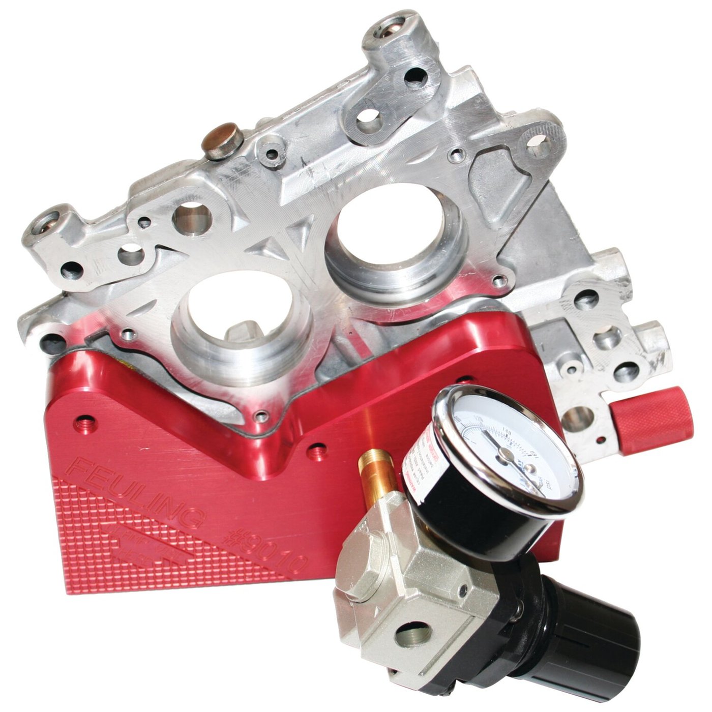 Used to bench test the camshaft support plate to ensure the working of oil pump pressure relief spring, a correct sealing relief valve and correct pop-off pressure to solve any issues in the engine before it hits the road. Works with all Twin Cam support plates. Includes air regulator, 0-100 psi pressure gauge, gasket & required hardware. Note: Perfect to test the Feuling 566114 oil pressure relief spring, enabling you to set pop-off pressure to your preference. Note: Feuling recommends 0-30 psi with full pop-off at 55-60 psi. Note: For replacement parts see 566118 gasket and 588063 air regulator.