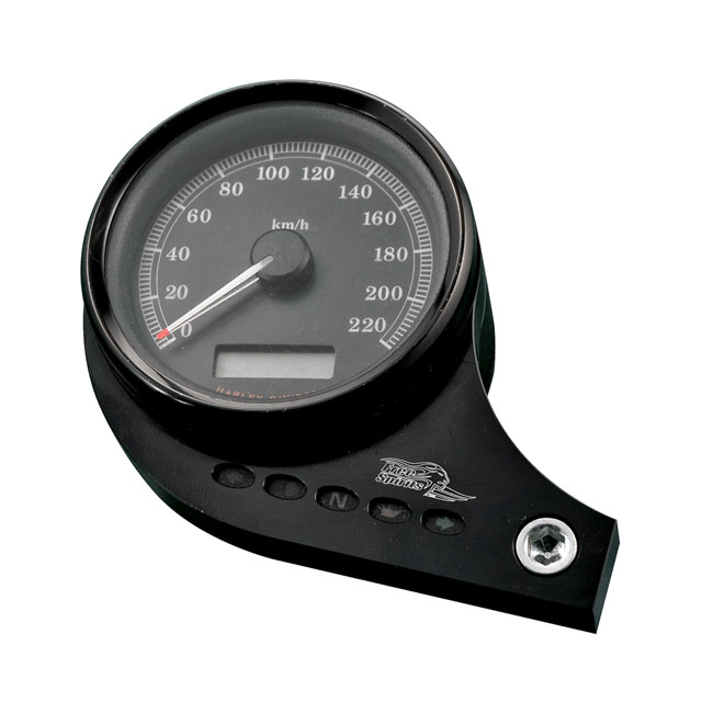 Black anodized billet CNC machined aluminum. Used to move your OEM speedo to the left side of the cylinder head. All speedo functions are retained. Note: Will not fit dual gauge models.