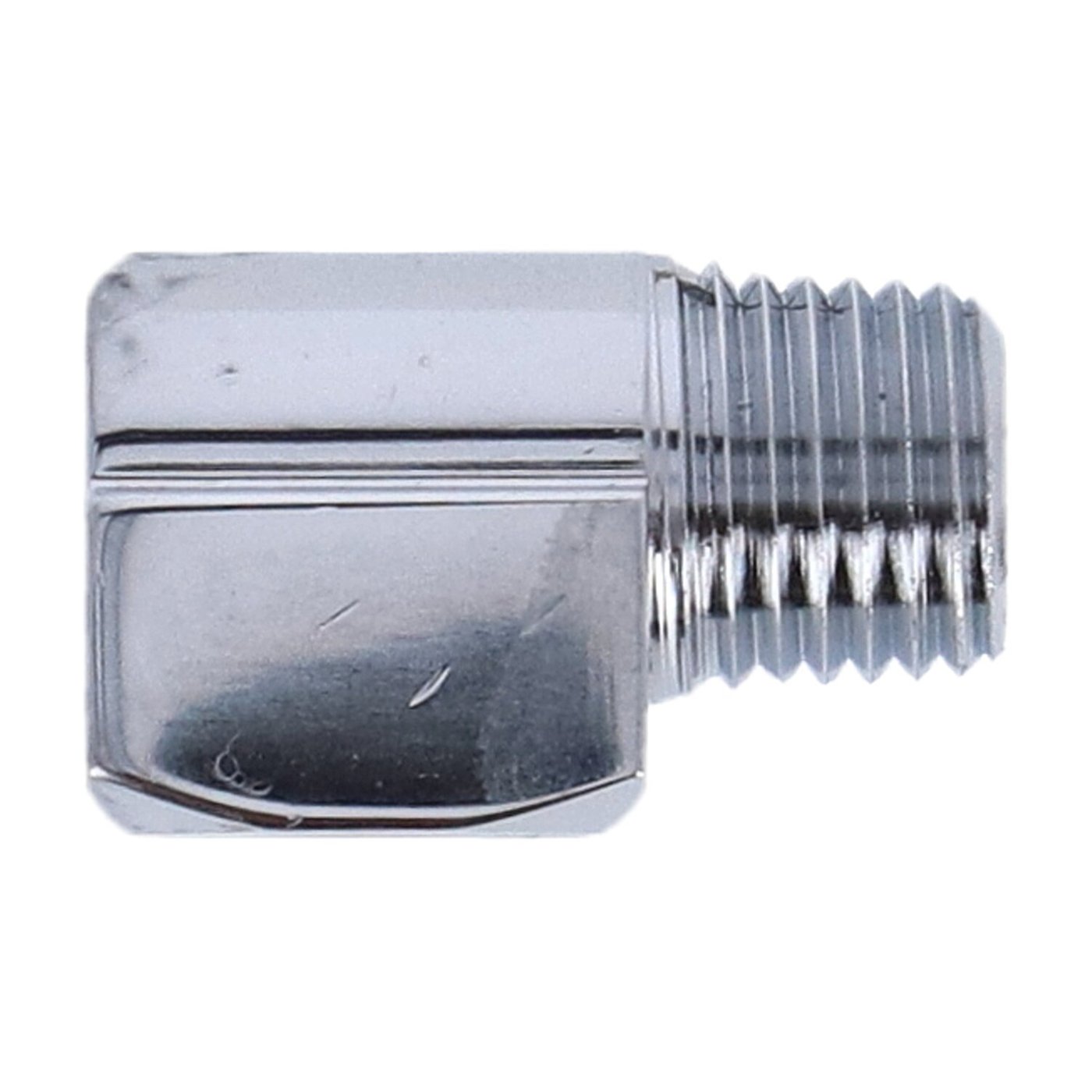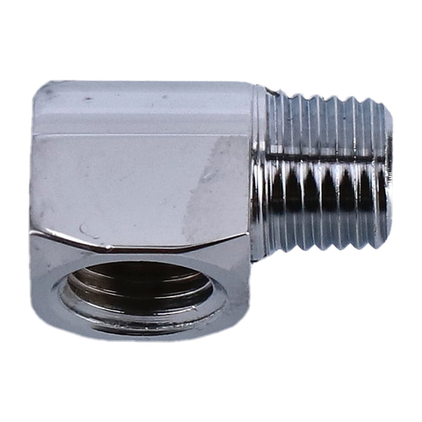 90° elbow adapter. 1/4 NPT male to 1/4 NPT female threaded.