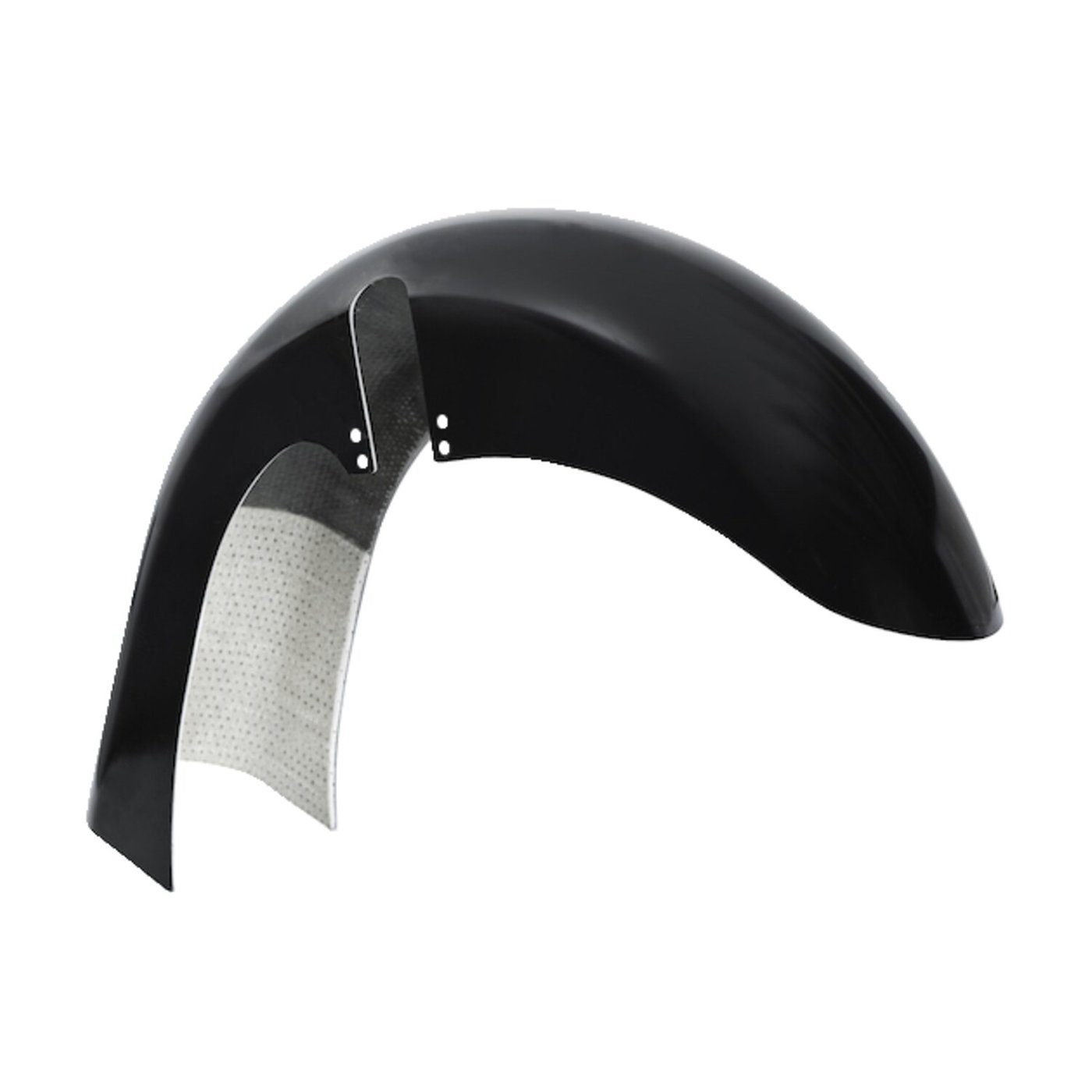 For fat 21″ x 5.50″ ‘Bulldog’ style wheels. A complete pre-drilled fender kit with bolt-on installation ease, it works in combination with the standard lower legs/fork sliders but special fork tube covers are required. Made of hand-laid unpainted black gel coated extra durable fiberglass that is very stiff, strong, straight and light. An additional ‘hardening layer’ is embedded for extra rigidity. Special CNC machined aluminum brackets and special stainless stiffening plates are included. Note: All parts require fitment checks before painting and final assembly. Note: These fenders must be used with special Slash Cut fork tube covers. Killer Custom 921653 or any other aftermarket item cut for wide wheels.