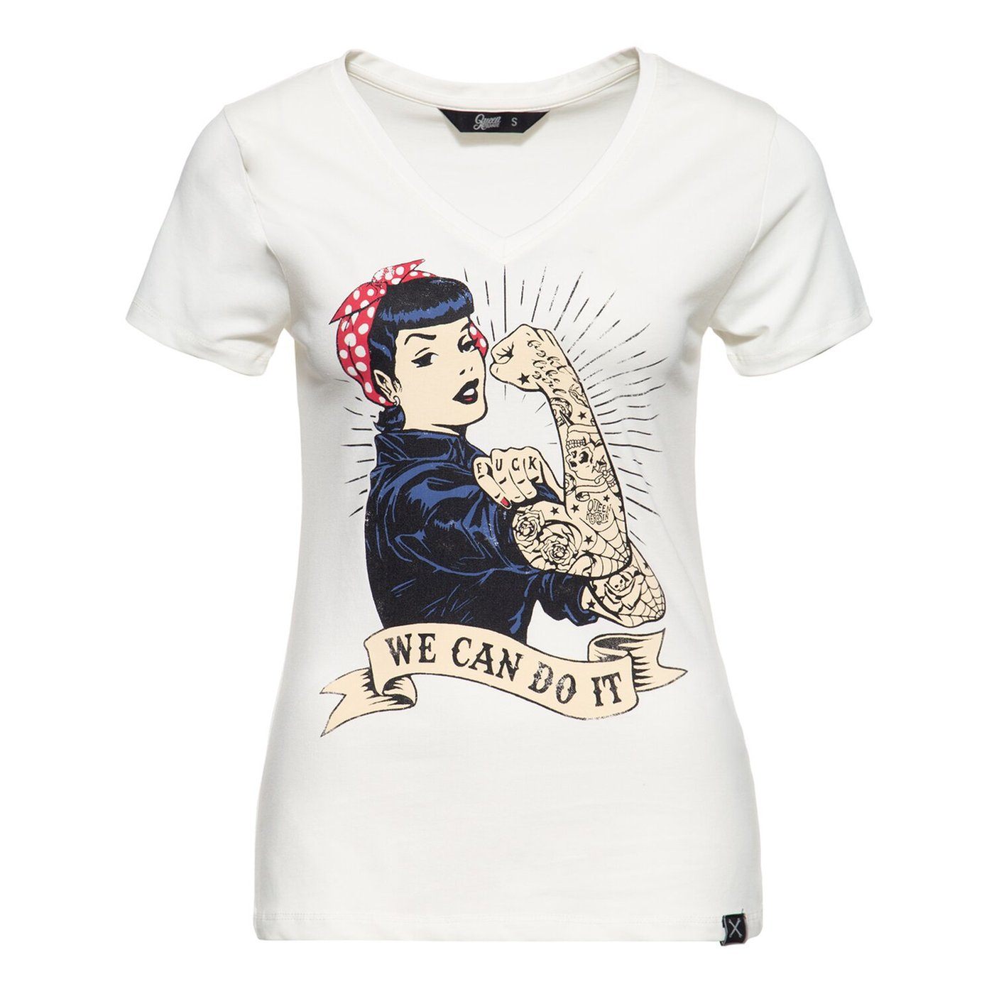 The print shirt from Queen Kerosin is full of girl power! It is made from a super soft cotton fabric that hugs the figure beautifully thanks to the stretch content! It has short sleeves and a feminine V-neckline. The “We can do it” print completes the retro look and makes a clear statement. The basic slim fit also offers lots of combination options for everyday wear! Available in several colors.