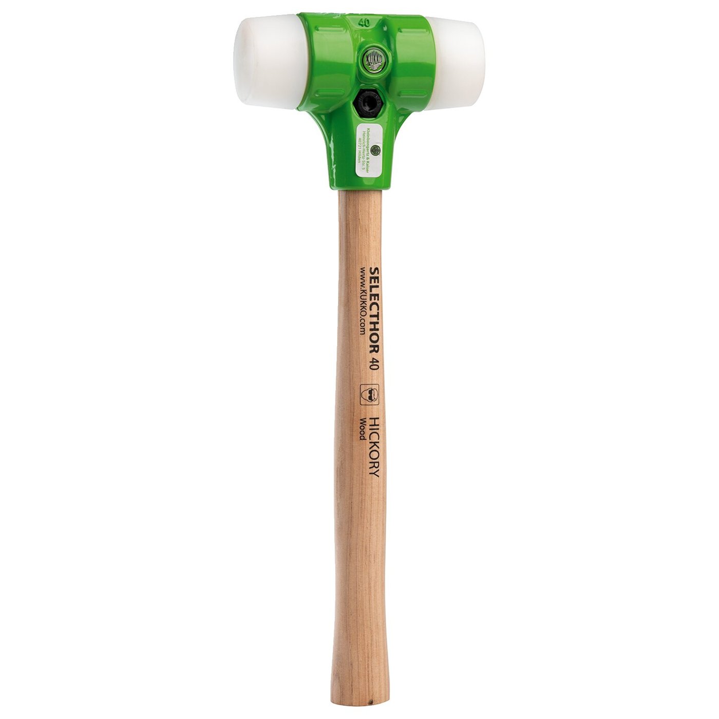 Soft face hammer with nylon impact elements for more delicate objects. With anti-rebound steel shot filling to help prevent bounce back and a hickory wood handle to further reduce vibrations. – Hammer length: 330mm – Diameter of inpact unit: 40mm – Hammer head height: 116mm – Non rebound: Yes – Impact insert fill quantity: 60 grams – Shore hardness: 85 Shore D – Material: NY (PA6) – Weight: 0.76kg