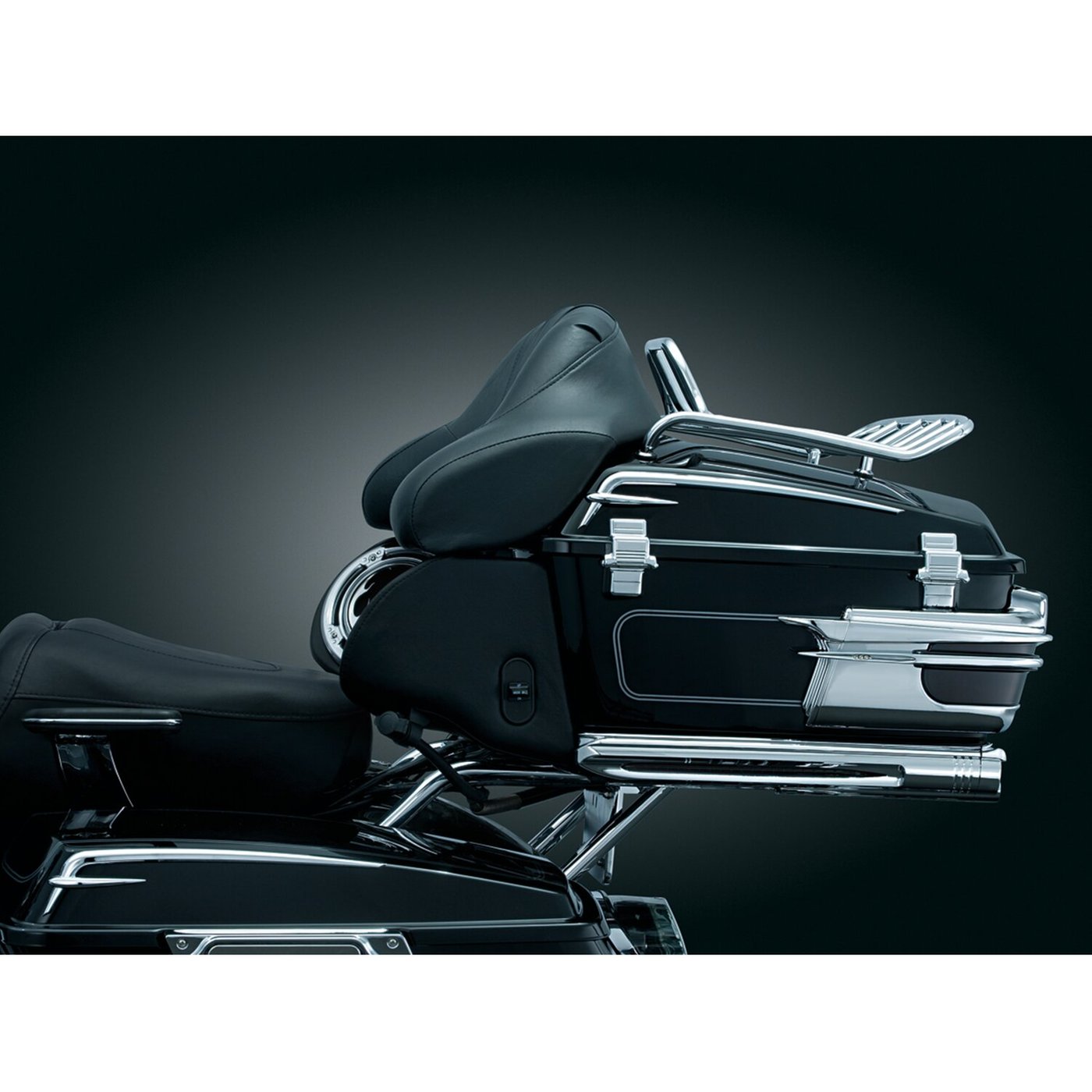 Allows up to 4″ of adjustability to the Tour-Pak®, 1″ forward and up to 3″ backwards. No tools required for adjustments. Note: Not compatible with H-D® enhanced sound system or Boom! audio for 08-earlier models. Not compatible with leather covered Tour-Paks. Will fit 98-00 Touring with rigid mounted Tour-Pak® if the stock support tube has been replaced with the 00-08 support. Note: See 542675 for optional pad & filler panel to fill the gap between passenger backrest and the seat.