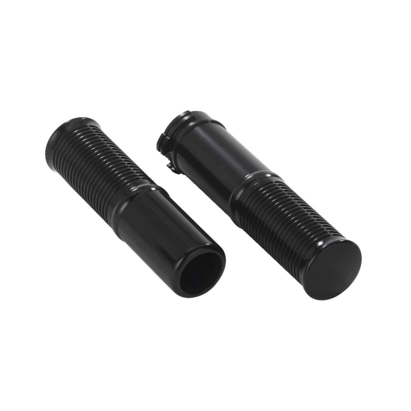 Black anodized aluminum finish. Fits 1″ diameter handlebars and will take single or dual throttle cables. At Kustom Tech style is King. It clearly shows in these handlebar grip sets in which each grip consists of two separate parts, smooth for the inner and ribbed for the outer piece, for an ultra cool Kustom look. Note: Great to style match with Kustom Tech hand controls. Note: Optional ribbed grip ends, with different finishes, are separately available to make grip sets in various combination finishes. For optional ribbed grip ends see: 914956 Polished brass. 914957 Satin brass. 914958 Chrome aluminum. 914959 Polished aluminum. 914960 Satin aluminum. 914961 Black anodized aluminum. 914962 Black anodized contrast cut.