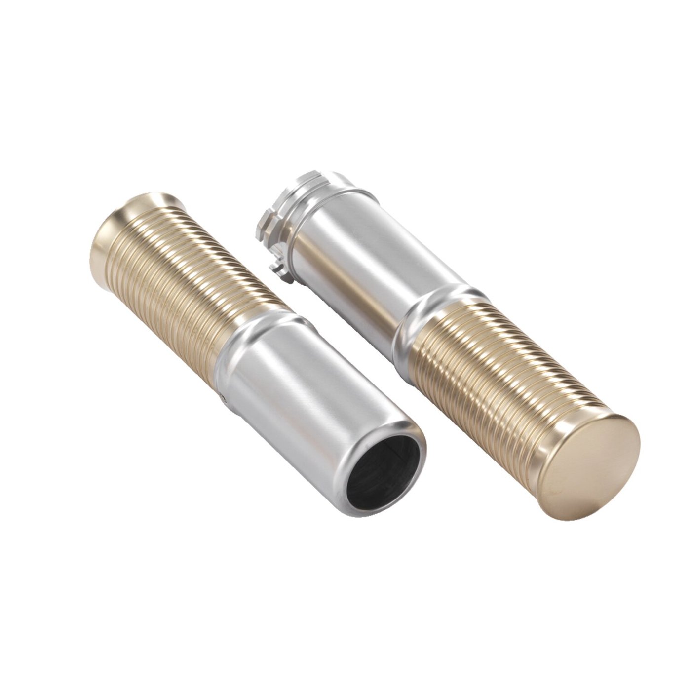 Aluminum and brass with a satin finish. Fits 1″ diameter handlebars and will take single or dual throttle cables. At Kustom Tech style is King. It clearly shows in these handlebar grip sets in which each grip consists of two separate parts, smooth for the inner and ribbed for the outer piece, for an ultra cool Kustom look. Note: Great to style match with Kustom Tech hand controls. Note: Optional ribbed grip ends, with different finishes, are separately available to make grip sets in various combination finishes. For optional ribbed grip ends see: 914956 Polished brass. 914957 Satin brass. 914958 Chrome aluminum. 914959 Polished aluminum. 914960 Satin aluminum. 914961 Black anodized aluminum. 914962 Black anodized contrast cut.