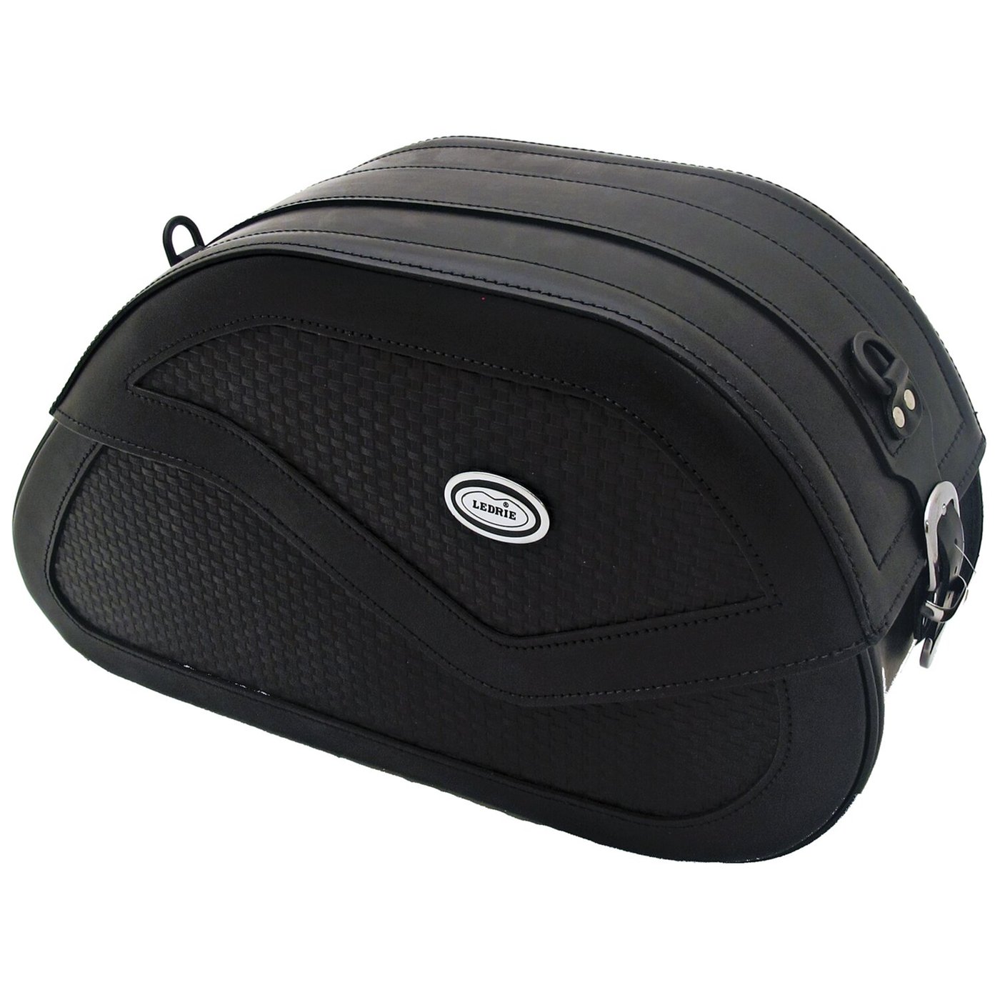 Basket Weave inlay. 33 liter per bag. Dimensions per bag: 55.5cm long x 19cm wide x 32cm high. Manufactured from premium quality 2.8mm thick split leather. All saddlebags, side bags and sissy bar bags come with a 4mm thick HDPE (polyethylene thermoplastic) back panel, unless mentioned otherwise. This is same material of which, for instance, kayaks are made, to ensure maximum strength & shape retention under harsh conditions. The reinforcing plate is sewn onto the leather, giving it excellent strength and great universal mounting options. A special groove is cut into the HDPE back plate, allowing for lowered stitching in the groove, below the surface of the back plate. This protects stitching from abrasion. All bags are pre-treated with a special oil for maximum life and water resistance. All bags are hand-made by experienced personnel to ensure a continuous high quality standard. Mounting note: These saddlebags can be used with the 559467 universal Ledrie saddlebag carrier set or with the 55946 Ledrie universal saddlebag support bracket. Since motorcycle specific application and rider preference differs no hardware is included and no provisions are made to mount the saddlebag to saddlebag carrier. Holes can be drilled in the reinforced rear section of the saddlebag, at the desired point and installed to the universal carrier frame, which must be ordered separately, or custom made. Many riders prefer a simple but effective installation to the carrier with some sturdy cable straps. Mounting note: Model specific hardware kits are available as 559463 for 91-03 Sportster, 559464 for 04-13 Sportster, 559465 for 86-17 Softail; 96-17 Dyna (excl. FLD); 14-20 Sportster. Note: 559457 turn signal relocation kit is available for 96-17 Dyna (excl. FLD Switchback models). Note: Dimensions and capacity are approximate and for reference only.