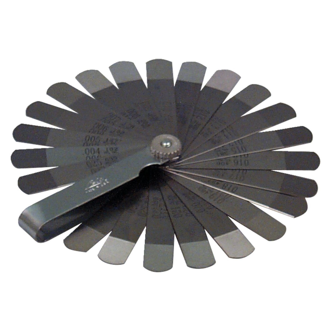 US sizes. Tool dimension 1/2″ wide x 3 1/4″ long. Stepped blades with a .002″ (.0508mm) step for very accurate settings. Note that sizes mentioned are the lowest, without the step, only. 22 steel blades .004″ to .014″ (.102mm to .356mm).