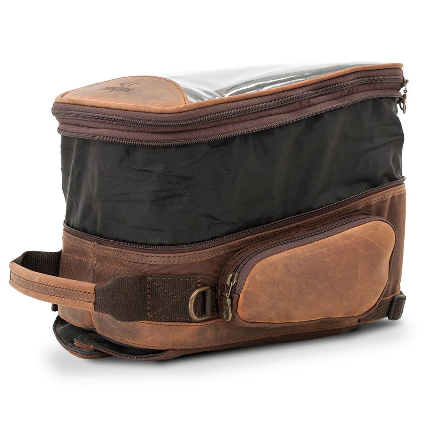 Strong canvas material, finished with genuine aged ranger leather. The bag can be extended to increase its volume, only when required to prevent an unnecessary ‘bulky’ bag. The touch screen of your device through the ‘see-through’ PVC window. A total of 8 strong magnets will hold your bag slip-free on the fuel tank. The tank bag is waterproof, through the integrated rain cover. For off-bike use you can use the integrated carrier handle, for more comfort an optional shoulder belt is available as 970952 black or 970953 brown. Dimensions: 31 x 17 x 22cm, extendable to 31 x 25 x 22cm. Capacity: 9 Liter, extendable to 14.5 liter.