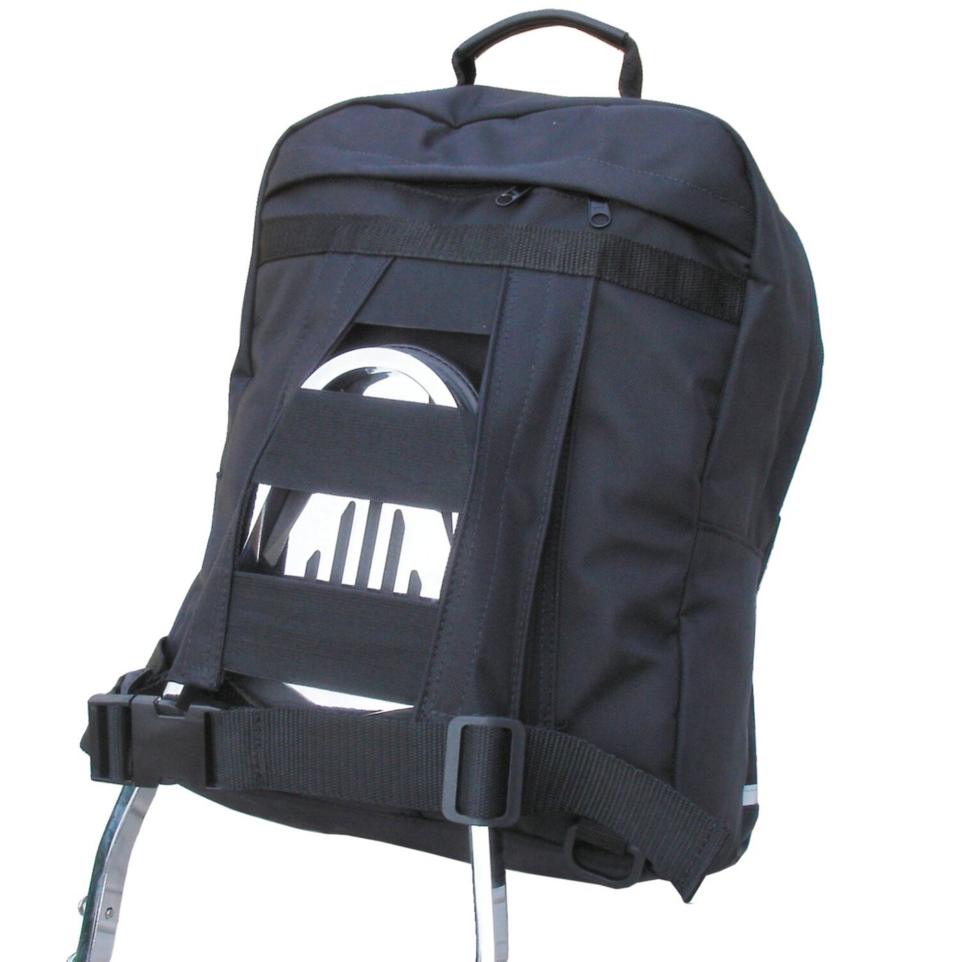 A holder is fixed on the black rucksack / sissy bar bag. The back can be securely tightened to the sissybar with a strap. Approx dimensions: 20 x 30 x 13 cm