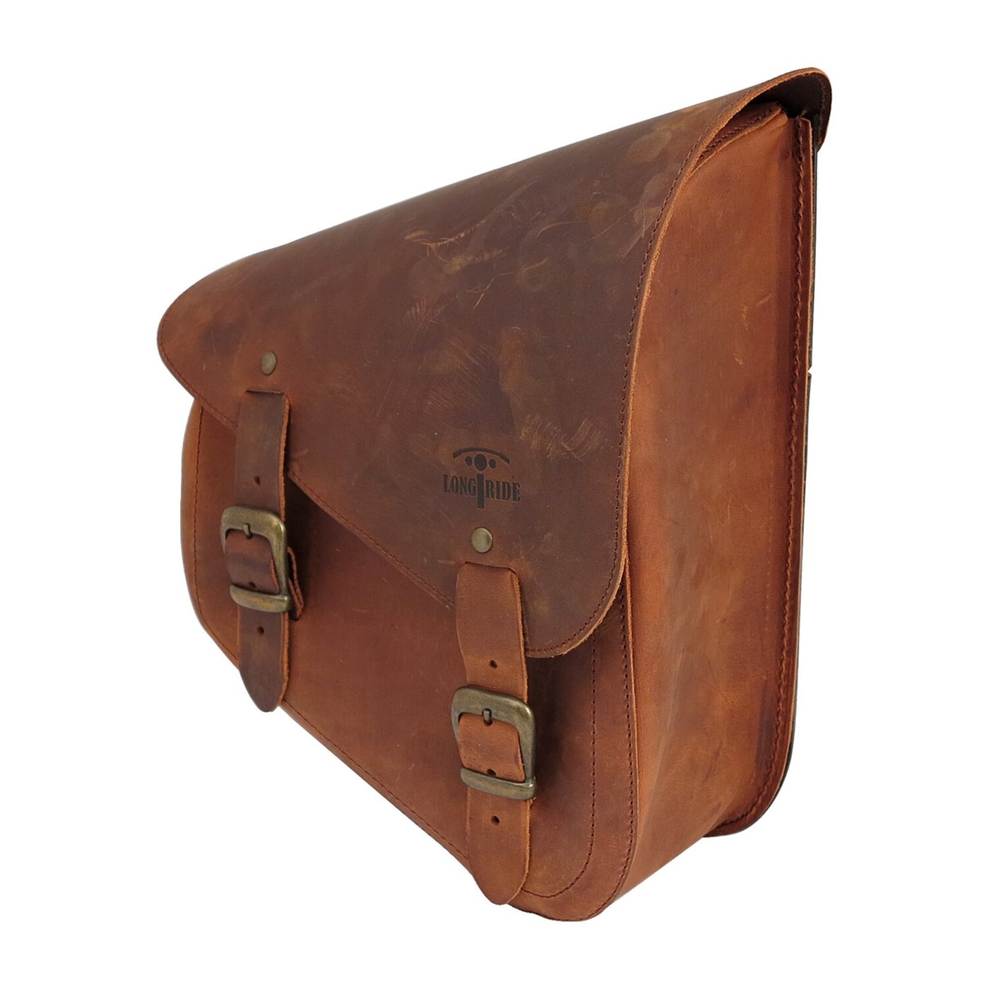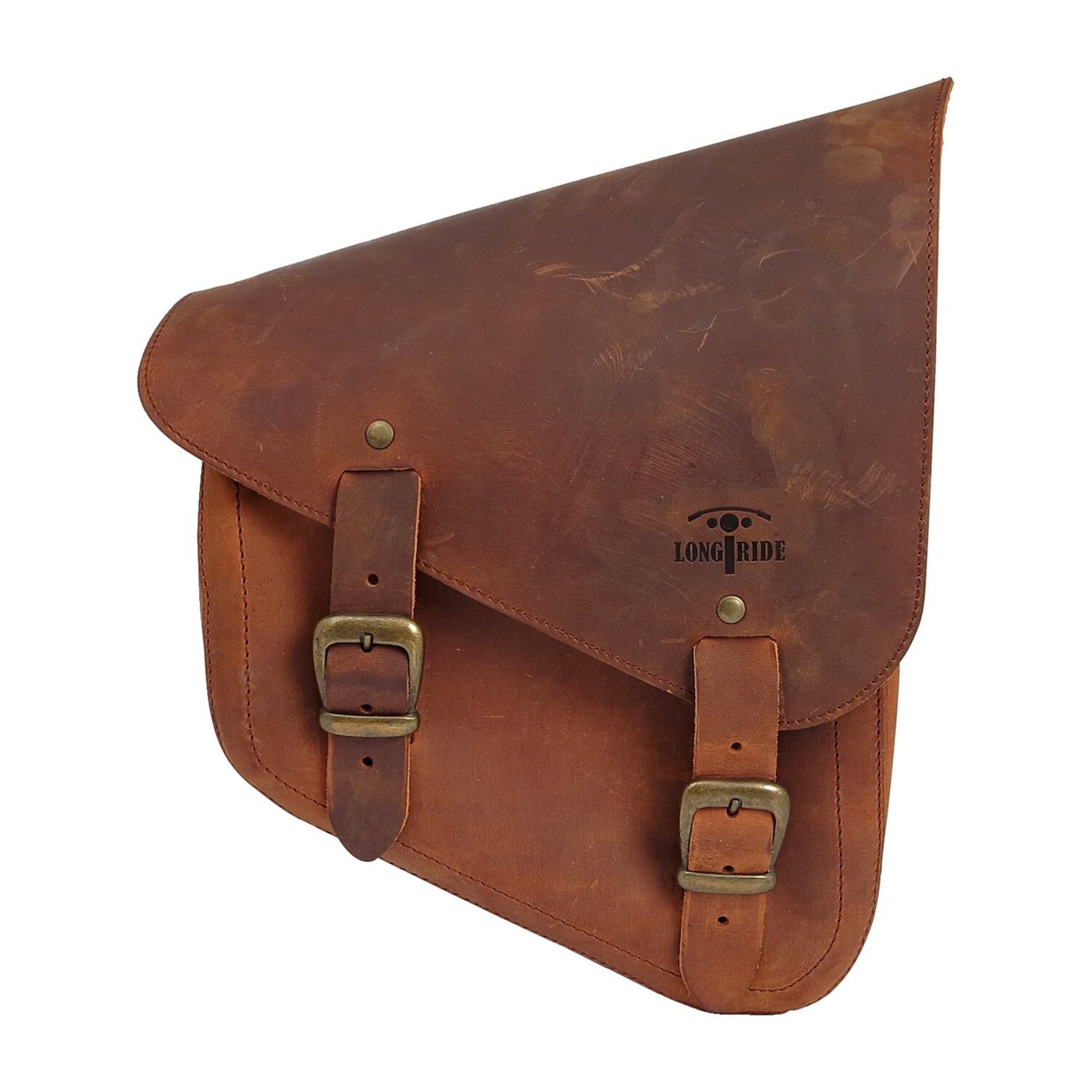 Brown leather. Mounts to left side frame tube so bag will sit next to swingarm. Comes with mounting straps for easy installation. Approx. dimensions 36 to 21cm high x 14cm deep x 31cm long.