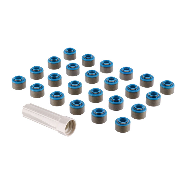 With 24 seals. Comes with with built-in spring-loaded Viton wipers. Valve stem seals can be used, and are recommended, on all applications. They will help control oil consumption in any type H-D engine. OEM replacement reference 18000-81. Note: Valve seal installation tools are not included and must be purchased separately when required.