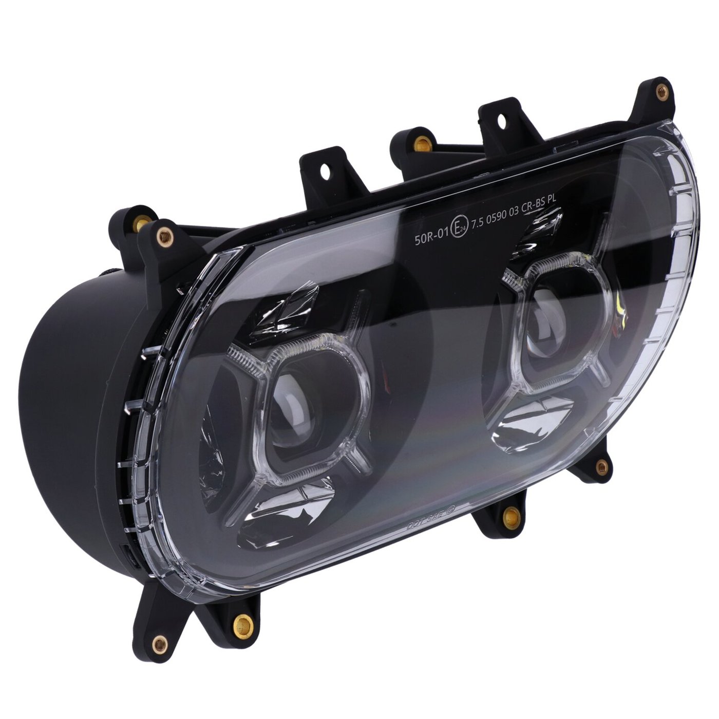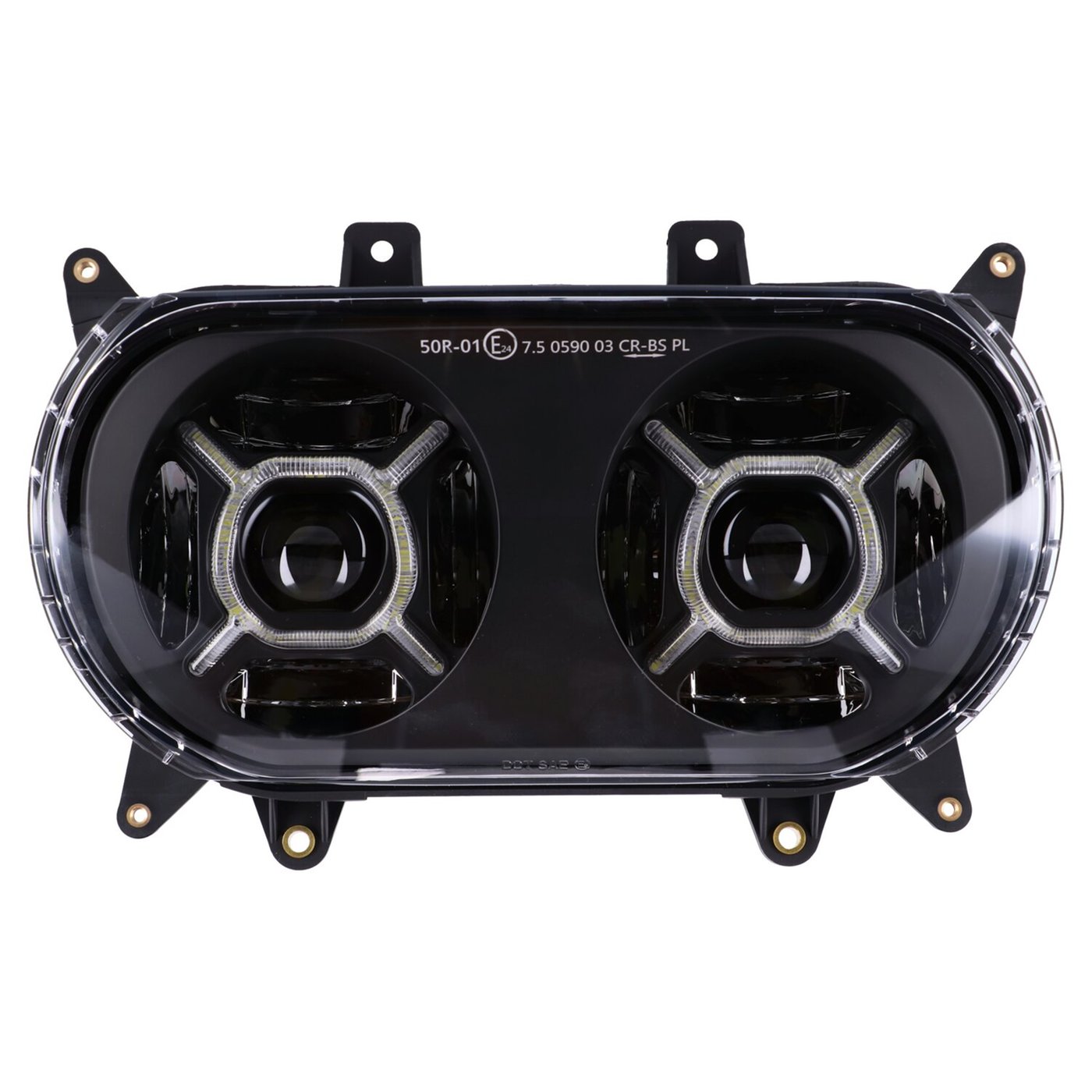 ECE & DOT approved. Black reflector. With white LED halo-ring/position light/DRL. Economical high/low beam LED conversion dual head lamp unit to replace the stock Road Glide’s dual H4 lamp unit. LEDs are an improvement at all levels when compared to H4 lighting and offer more effective and whiter light at 6500K, much better reliability and less amperage draw. – With white halo-position light – Unit comes complete with wiring with a 3-prong plug that is identical to a standard H4 light bulb, allowing a plug & play conversion – Compatible with left side (UK) & right side (EU) driving – 205.4mm (8.08″) high – 333.4mm (13.12″ wide – 168.4mm (6.63″) deep – 6500K color temperature – 12-Volt DC – High beam 38W – Low beam 24W