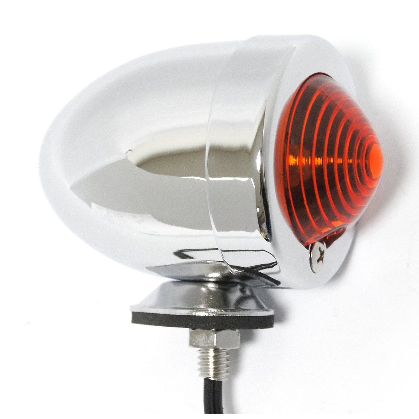 – Chrome housing – Amber lens – Dual Filament bulb – Stud mount – 12-Volt – The classic bullet, ready to revive the 60’s.