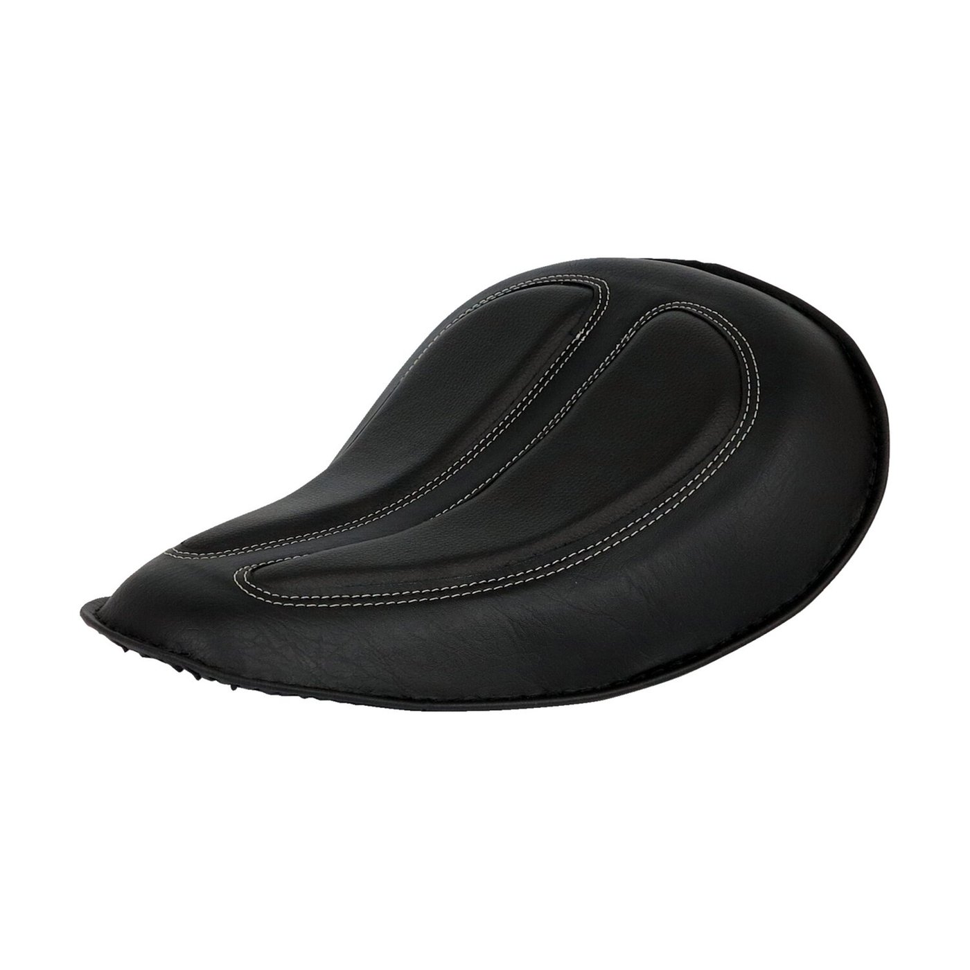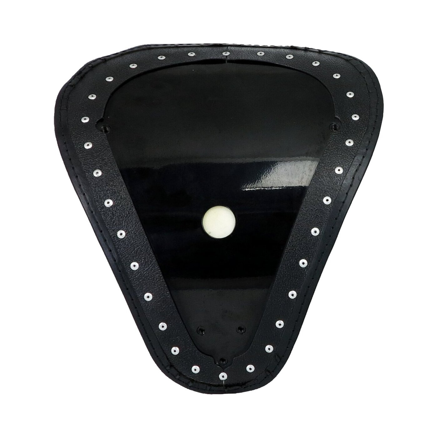 Black with black seat panels. Synthetic leather upholstery. Manufactured with a sturdy steel black powder coated base plate with 6cm thick foam padding for a good combination between looks and comfort. The dual seat panels give it a sniff of 1910’s racing flavor. Dimensions approx.: 12-1/2″ (31.8cm) long x 10″ (25.4cm) wide x 6cm thick. Note: Mounting studs A=22.5cm, B=23cm.