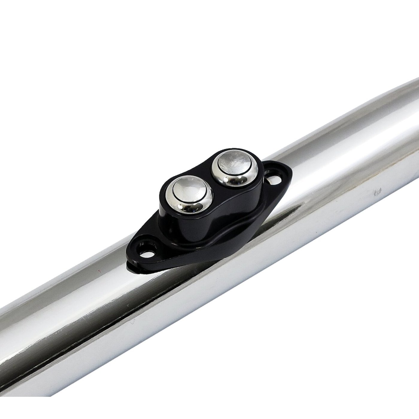 Billet aluminum housing, with two pre-wired stainless momentary push button switches, curved to follow handlebar contours when installed. Can be used as horn, starter or turn signal switch. Mounts directly to the handlebar. Offers a perfect seamless fit on 1″ diameter bars and will show a little ‘air gap’ on the smaller 7/8″ (22mm) bars, an aesthetics issue if anything. Approx. dimensions: Body 21.2mm high x 51mm wide. Switch head, without bezel Ø 11.9mm, switch head with bezel approx. Ø 17.5mm, switch knob housing Ø 7.9mm with 5/16″-24 threads.