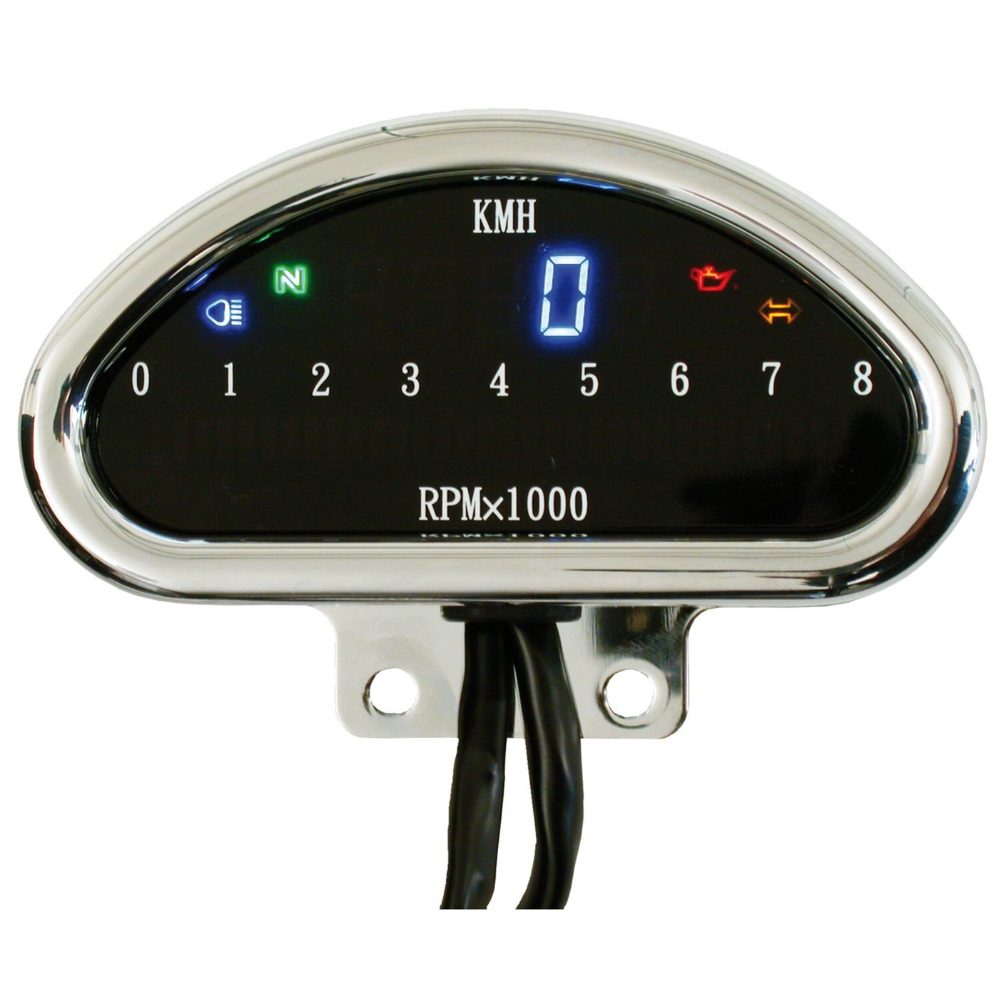 Displays speed, total distance and trip meter. LEDs are used for tachometer. Includes high/low beam, turn signal, oil and neutral light. Dimensions 110mm x 57mm x 37,5 mm. Note: For matching handlebar mount bracket see 500479 (chrome) or 500744 (black).