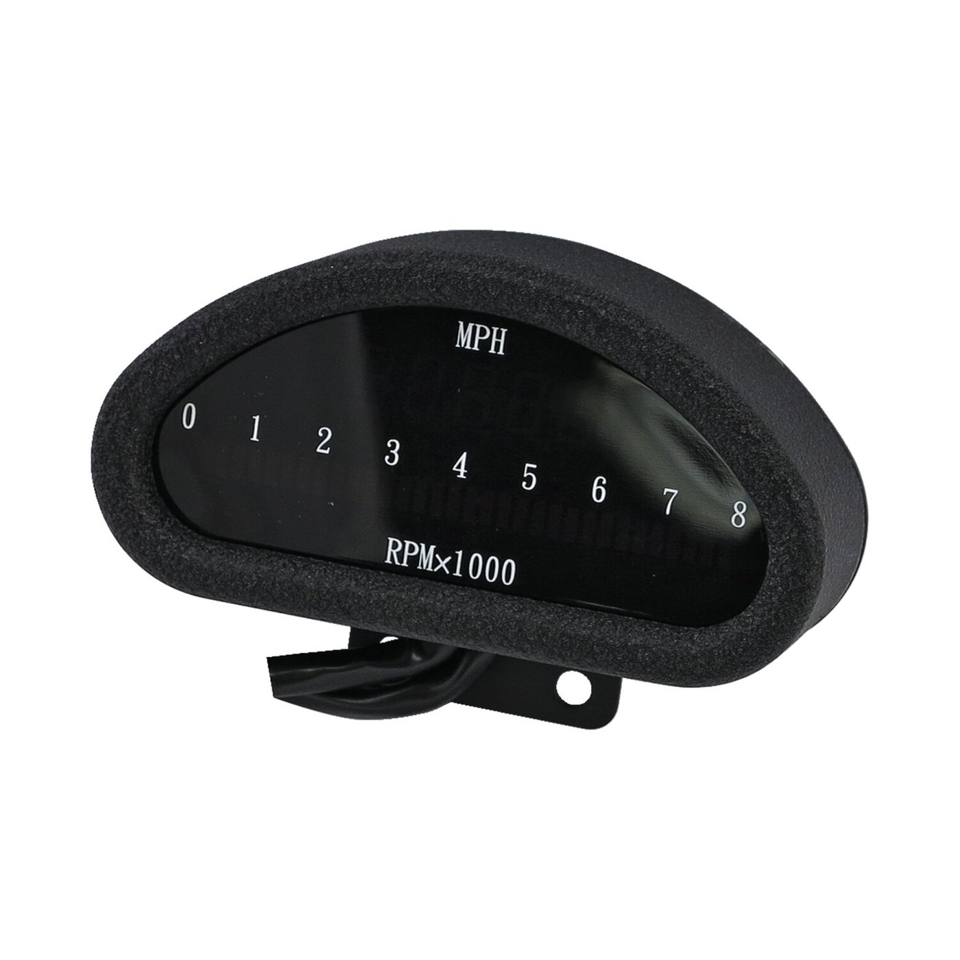 Black wrinkle finish. Displays speed, total distance and trip meter. LEDs are used for tachometer. Includes high/low beam, turn signal, oil and neutral light. Dimensions 110mm x 57mm x 37,5 mm. Note: For matching handlebar mount bracket see 500479 (chrome) or 500744 (black).