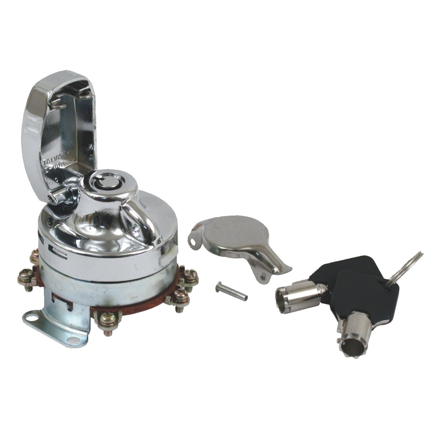 FL style ignition switch, ‘electronic’. round key, chrome fits 73-95 FL, FX, FXWG models with dual fuel tank mounted ignition switch (NU)