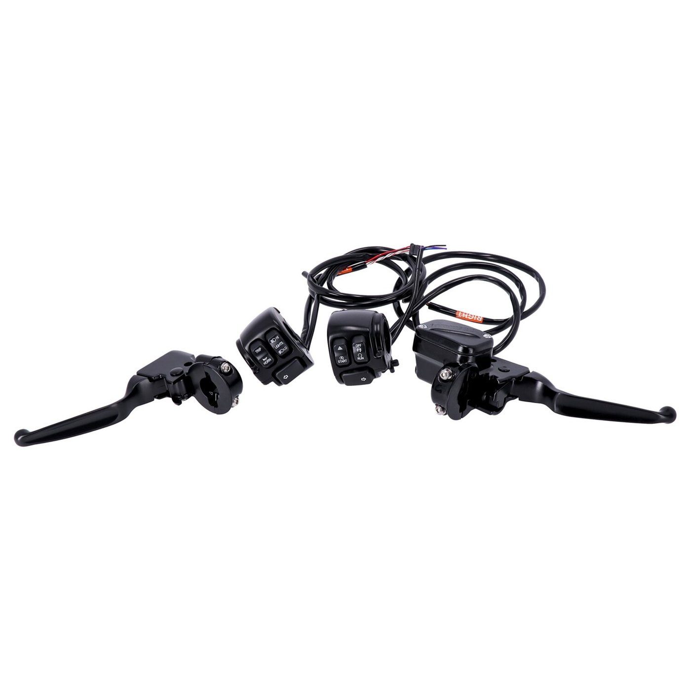 For H-D CAN-bus wired models. Includes left side mechanical clutch lever assembly and right side hydraulic draulic brake master cylinder assembly. Complete with stock style switch housings and right & left side switch modules with black switches. The right side kit includes the front brake switch, the left side includes the clutch switch. Both come with a 48″ long wiring harness for compatibility with al handlebars from standard to extra high or wide bars. Note: Two CAN-bus styles are used on H-D models. A) Pre-2016 models: The turn signal switch is connected directly to the turn signal. B) 2016-present models: The turn signal is directly connected to the BCM (Body Control Module) and the turn signal switch to the ECU (Electronic Control Unit) This handlebar switch & wiring kit fits both A and B models. An additional turn signal wire is installed on both left & right side for compatibility with the early Pre-2016 CAN-bus models. Note: Will not fit models with cruise control. Note: See 920673 for replacement front brake switch only and 920711 for replacement front clutch switch only. Note: See 920512 (brake side) and 920647 (clutch side) for replacement complete switch & wiring module kit.