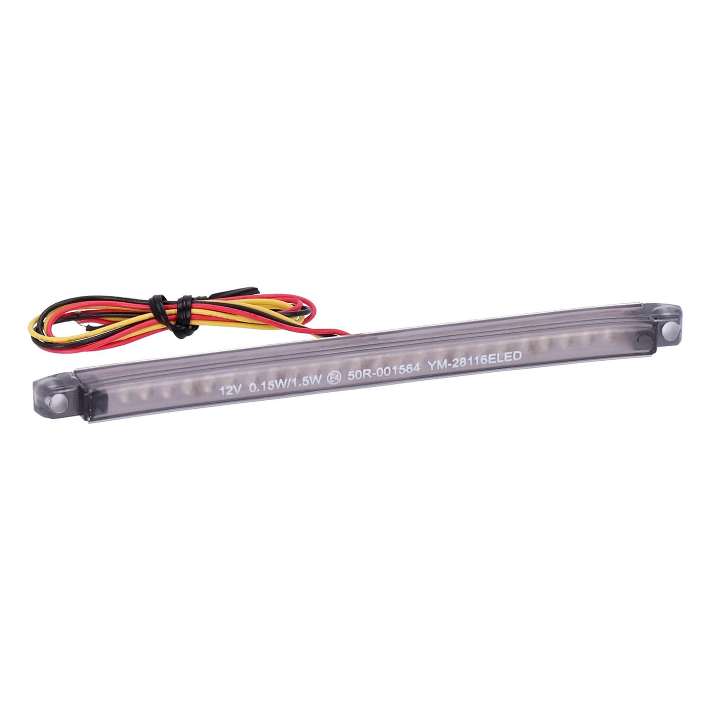 Great for those interested in miniature taillights. This strip contains 22 LEDs, and it has both a taillight & brake light function with ECE approved light smoke or red lens. With self adhesive rear backing. Dimensions: 8mm x 127mm x 10mm high. Note: No license plate illumination.