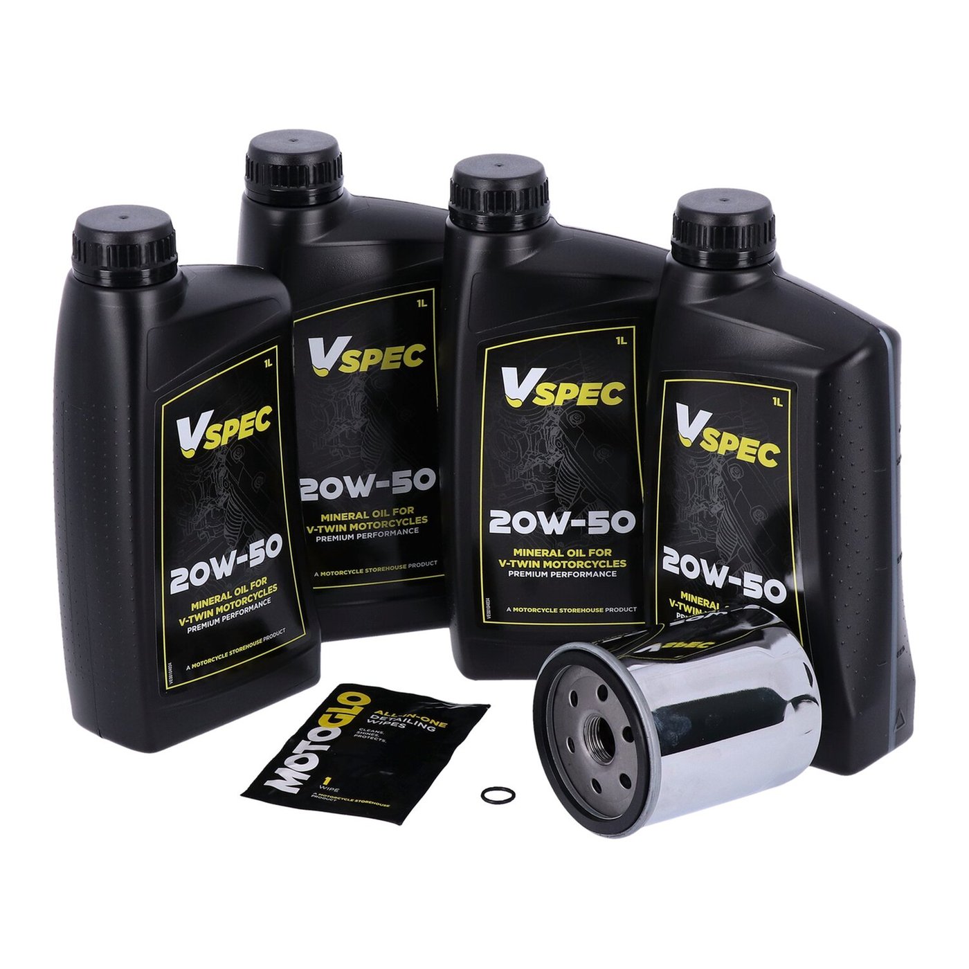 4 liter. Chrome oil filter (63796-77A / 63805-80A style). Basic service kit with an oil filter, o-ring drain plug and enough engine oil to service the specific model as mentioned. Used to service your bike during a regular service interval or before you store it for the for the winter period. Note: Comes with genuine Vspec high quality mineral engine oil for all stock to high output engines that require mineral engine oil. Note: Used oil may contain harmful acids and/or other contaminants. Therefore it is advised to do an oil and filter change before winter storage. Note: Check your service manual for the recommended factory oil change intervals.