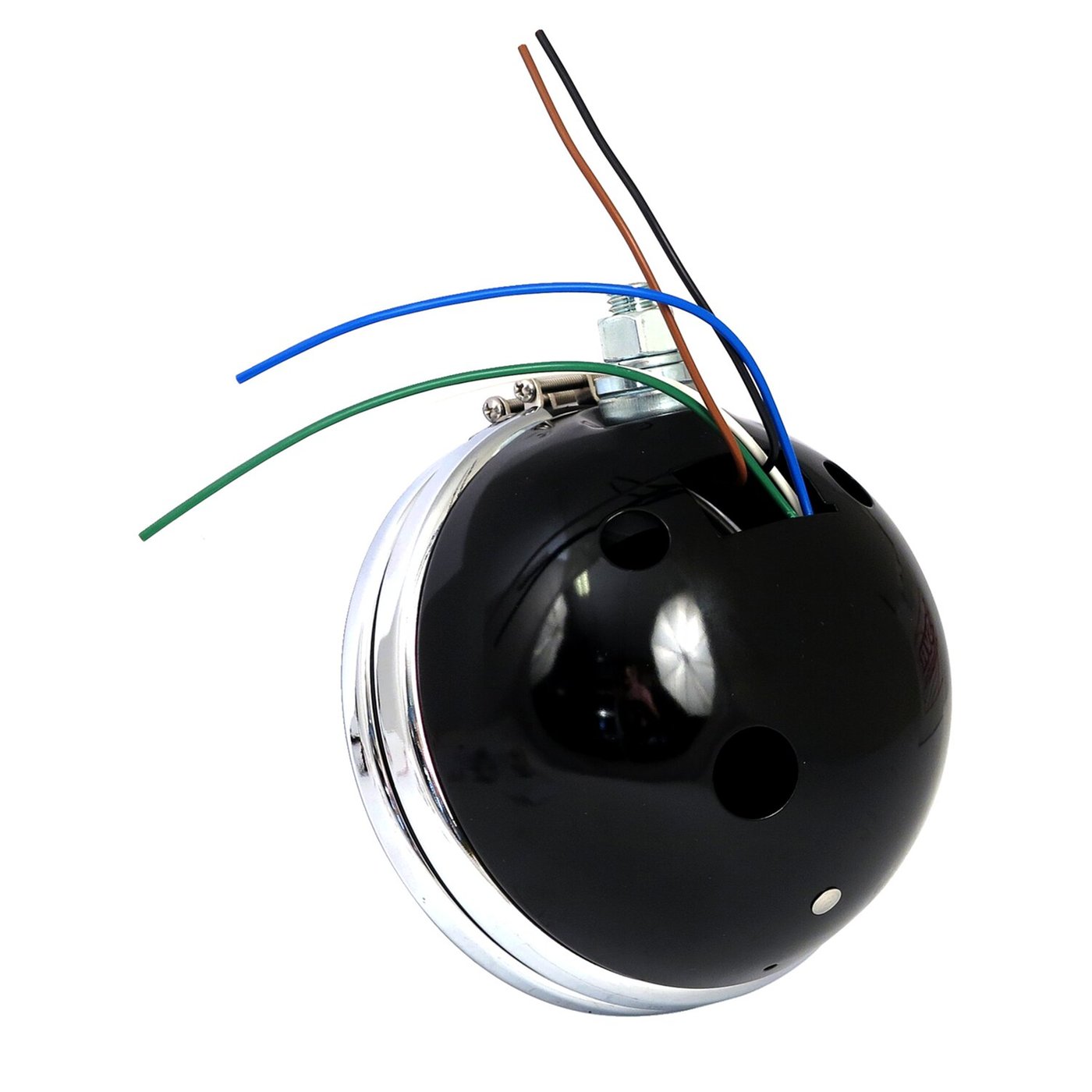 Black, with chrome trim ring. Stock style replacement for the standard early 5-3/4″ headlamp assembly. ECE-approved. With a 12V H4 55/60W bulb. OEM replacement reference 67705-74.